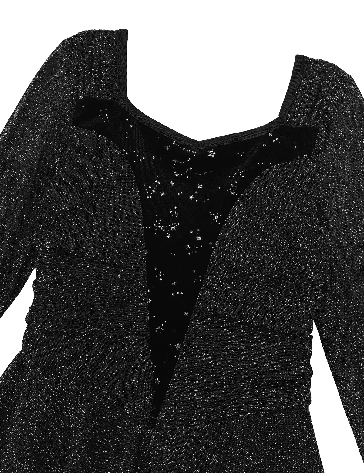 Shiny see through long sleeves, intricate silver glitters velvet is cut in a flattering curved shape at the front and back. Lined bodice.