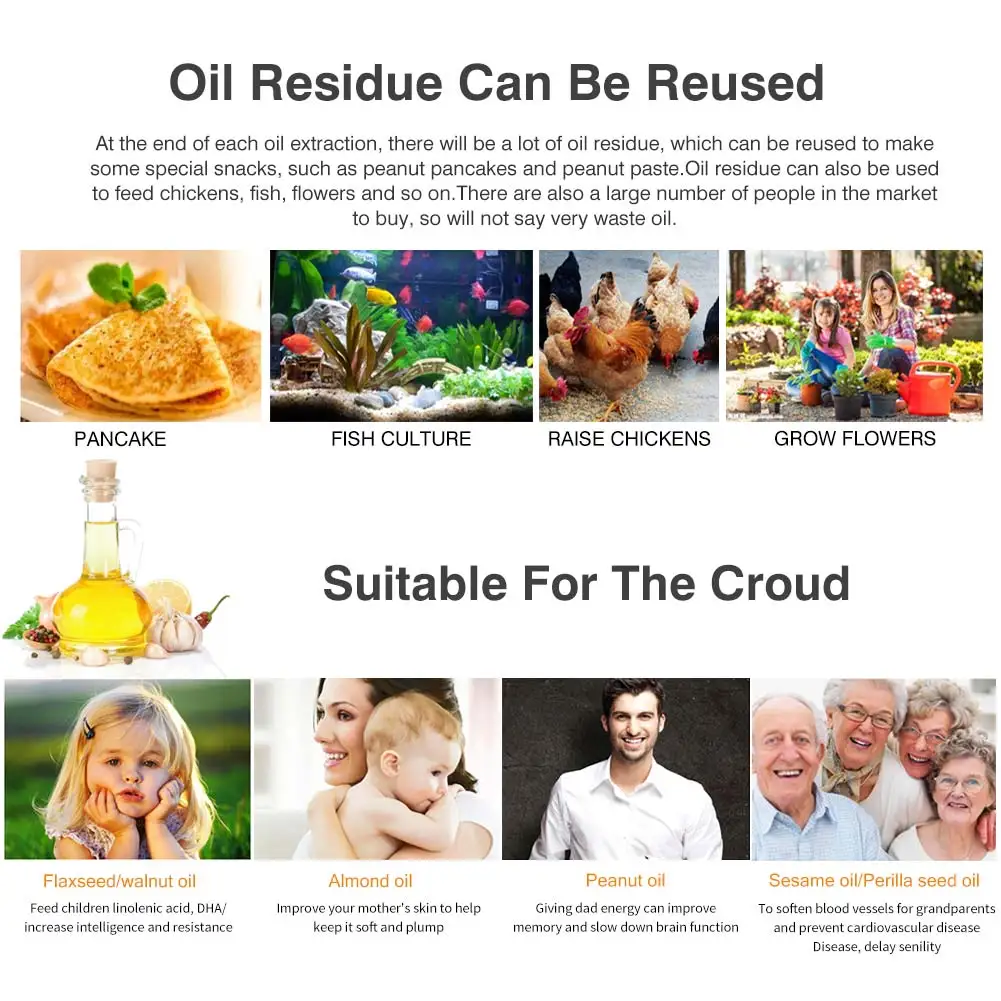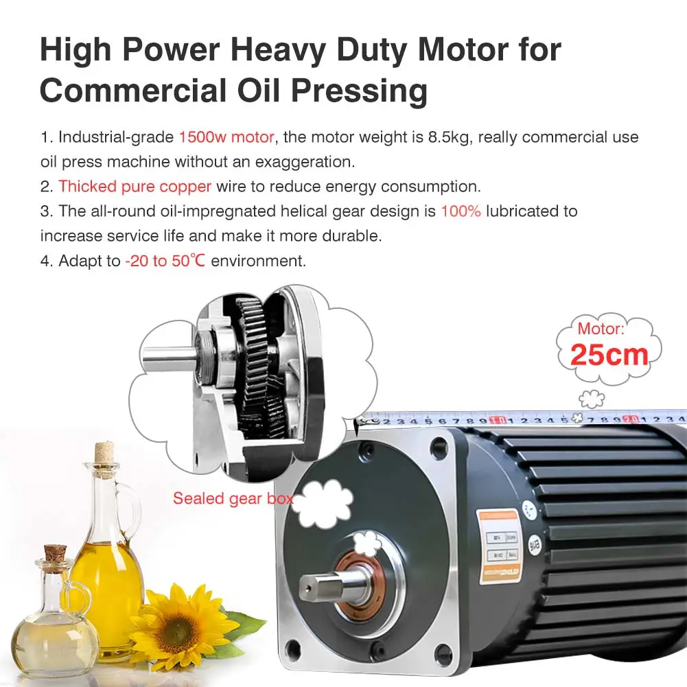 1. Легко установить. Низкий уровень шума и длительная работа, длительный срок службы. 2. Принимает высококачественный материал из нержавеющей стали, устойчивый к коррозии и прочный. 3. Мощность двигателя достаточно велика: она может выдавливать семена розы, семя киви, кокосовый порошок, виноградные косточки, семена конопли, окура, сои, Перилла, семена льна, семена льна, семена камелии, семена грецкого ореха, рапс, черный кунжут, семена белого кунжута, семена подсолнечника, миндаль, Арахис с красной/белой кожей, семена перца, семена тыквы, кедровые орехи, очищенные орехи (морской кокос), большие ядра семян клена, семена кипариса, ароматный Медлар, семена Кастора, шиндра, семена сафлора, samara, Красная бобовая паста и т. Д. 4. Поверхность чехол закрыт без каких-либо покрытие, где не видно отпечатков пальцев и отпечатков пальцев не оставляют в тех случаях, когда чехол касании вручную. 5. Масляный Пресс нуждается в сильной мощности и высоковостребованной технологии прессования. Он занимает первое место во всех труднопрессованных маслах, и его нет (для чистых натуральных машин, ядер конопли, соевых бобов и т. Д. Очень мягкое сырье).