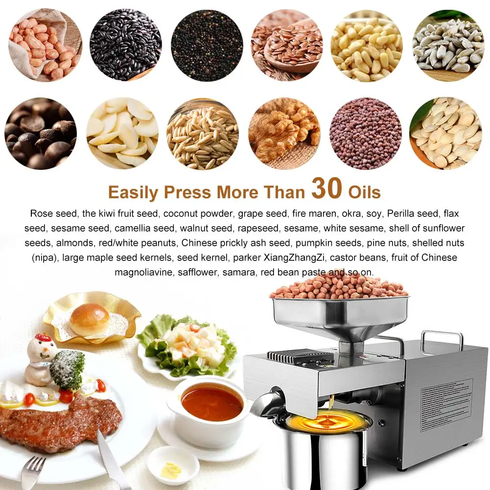 Вы можете выжать любые семена подсолнечника, фисташки, арахис, фундук, грецкие орехи, рапс и т. Д. Но перед прессованием зерна все зерна должны быть полностью обезвожены, очень сухими. Более того, все масляные ингредиенты должны быть очищены в прессе, и многое другое.