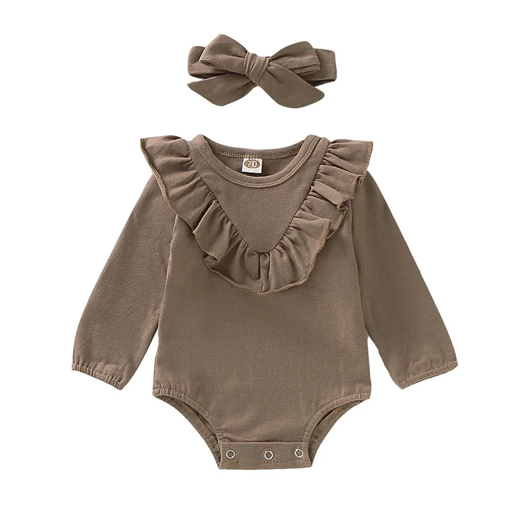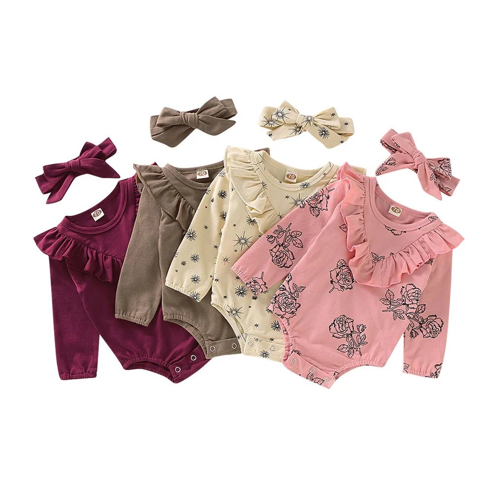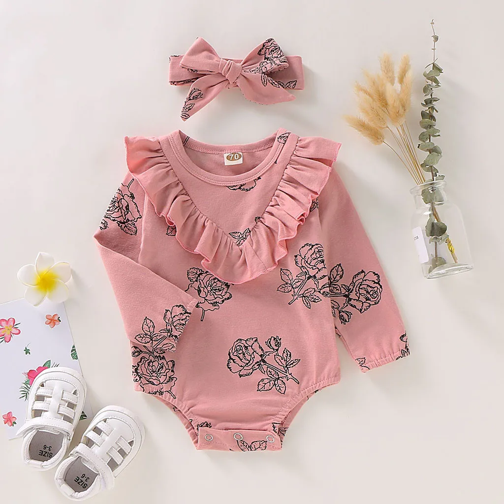 Комбинезон с цветочным рисунком для новорожденных девочек и мальчиков, боди, повязка на голову с оборками, комплект одежды