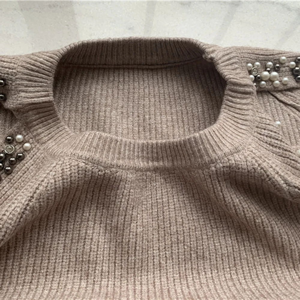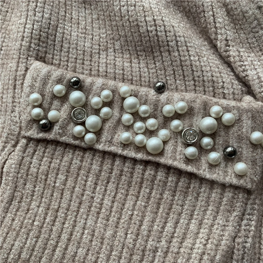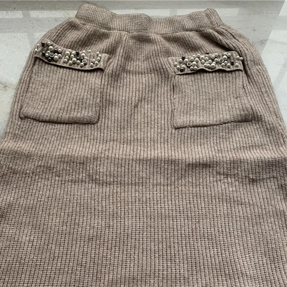 Жемчужный свитер, женские костюмы, модный вязаный свитер с открытыми плечами и рукавами и Юбка До Колена, Женский комплект из двух предметов, офисные женские костюмы