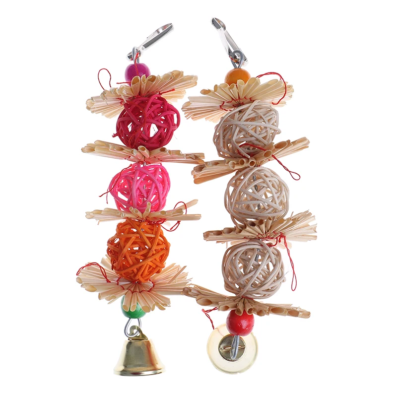 Висит на клетке, удобно для них играть и жевать.