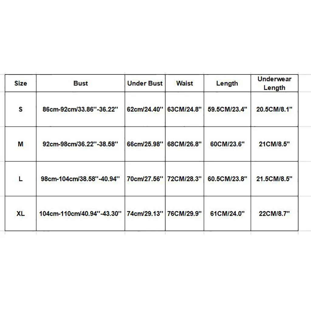 Размер Бюст Под грудью Талия Длина Длина нижнего белья S 86 см-92 см/33,86 ''-36,22'' 62 см/24,40'' 63 см/24,8" 59,5 см/23,4" 20,5 см/8,1 дюйма М 92 см-98 см/36,22 ''-38,58'' 66 см/25,98'' 68 см/26,8" 60 см/23,6" 21 см/8,5" L 98 см-104 см/38,58 ''-40,94'' 70 см/27,56'' 72 см/28,3 дюйма 60,5 см/23,8" 21,5 см/8,5 дюйма XL 104 см-110 см/40,94 ''-43,30'' 74 см/29,13'' 76 см/29,9" 61 см/24,0" 22 см/8,7"