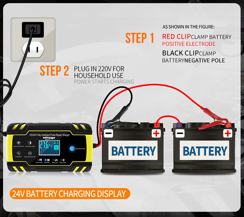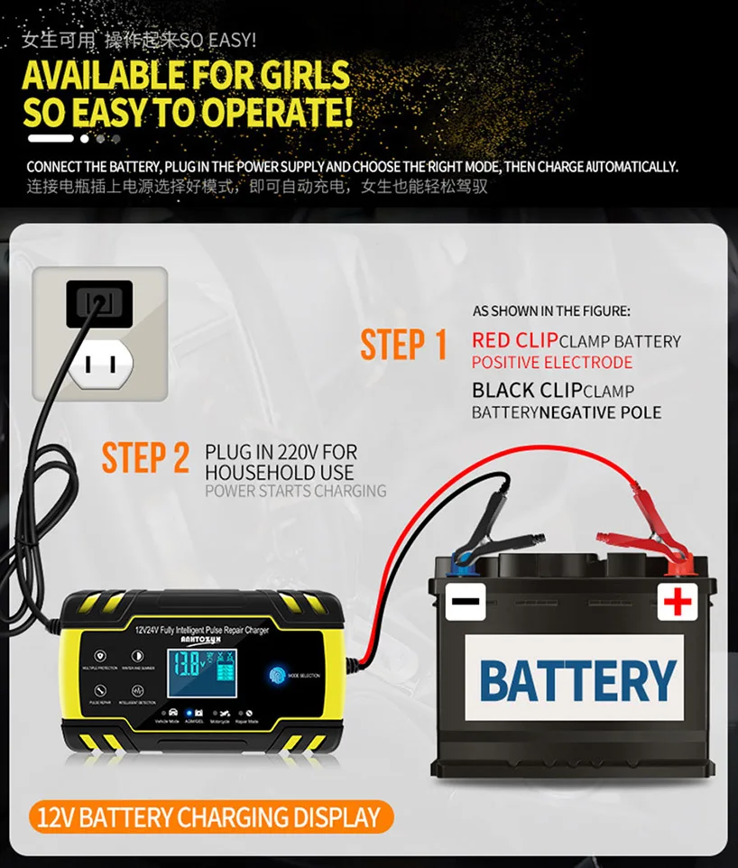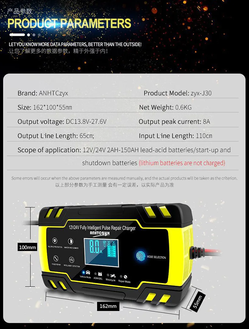 Вы можете заряжать 2A для 150A свинцово-кислотные/AGM/гель Батарея, универсальный для автомобиля/мотоцикла/трехколесного велосипеда/грузовик/вилочный погрузчик/экскаватор/бульдозер и так далее