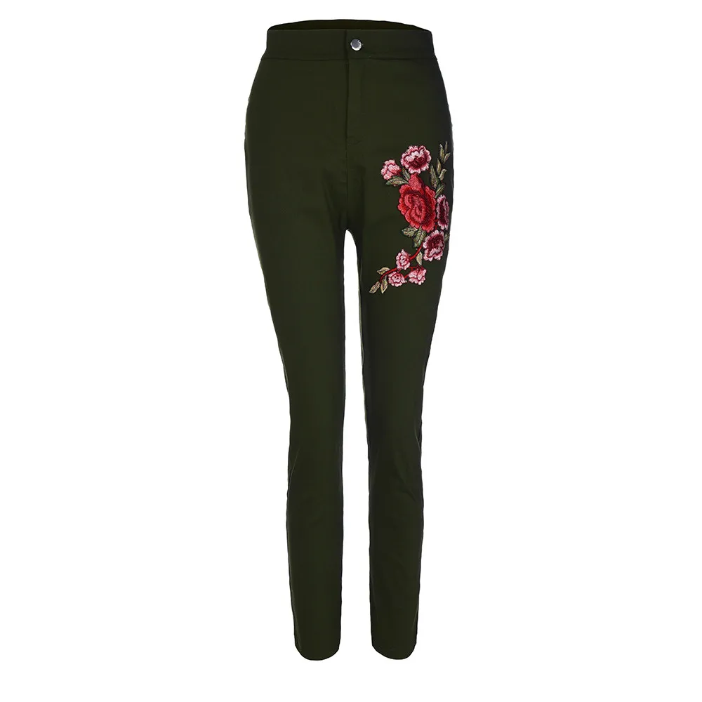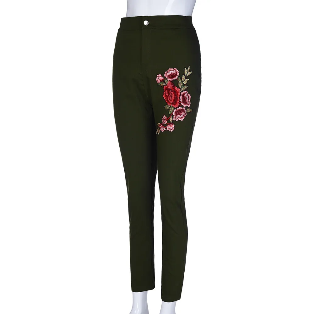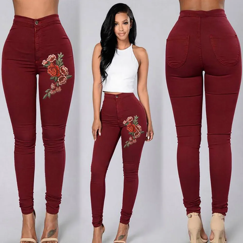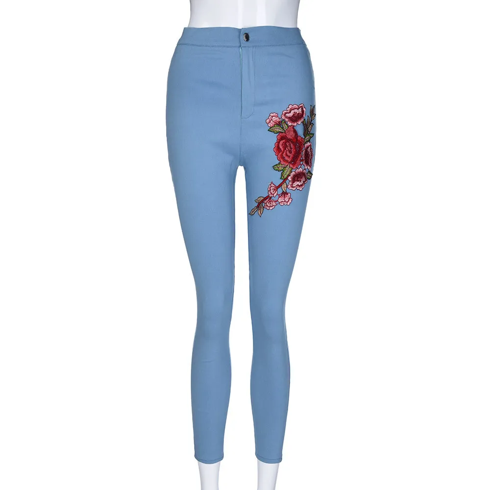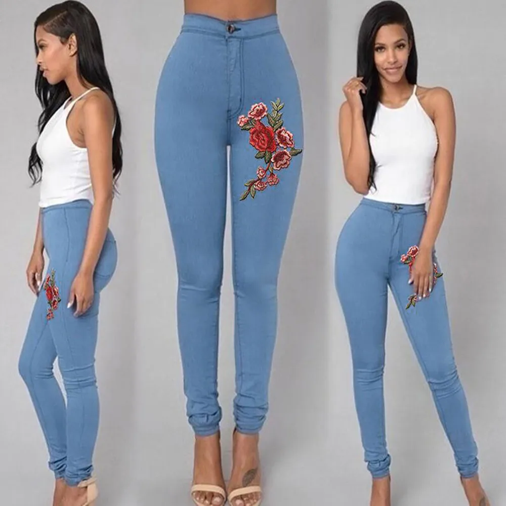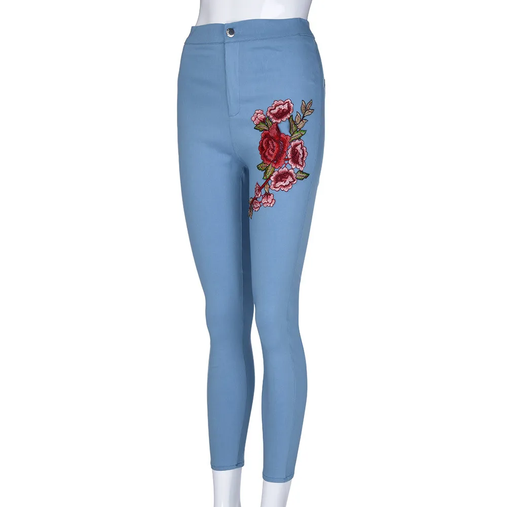 Модные сексуальные женские обтягивающие Цветочные аппликация на джинсы с высокой талией стрейч карандаш брюки