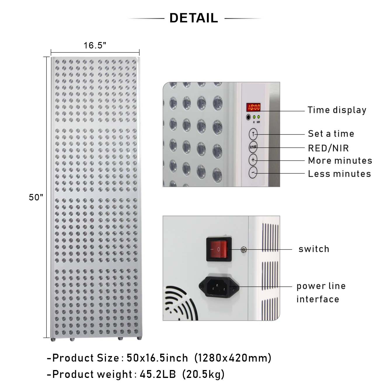 Параметры Название продукта: IL-TL800 светодиодный светильник Светодиодный Кол-во: 480 шт. 3 Вт/5 Вт Номинальная мощность: 680 Вт Два переключателя: красный и инфракрасный Длина волны: 660нм: 850нм = 1:1 Продукт Размеры: 50x16,5 дюймов (1280x420 мм) Излучение:>100 мВт/см2 Вес продукта: 45.2LB (20,5 кг) Сенсорный экран Экран: Да Защитные очки: Да Гарантия: 2 года Что в коробке, если вы покупаете эту модель для использования? 1 TL800 светильник + 1 пара металлическая вешалка + руководство + кабель с настраиваемой вилкой + защитные очки