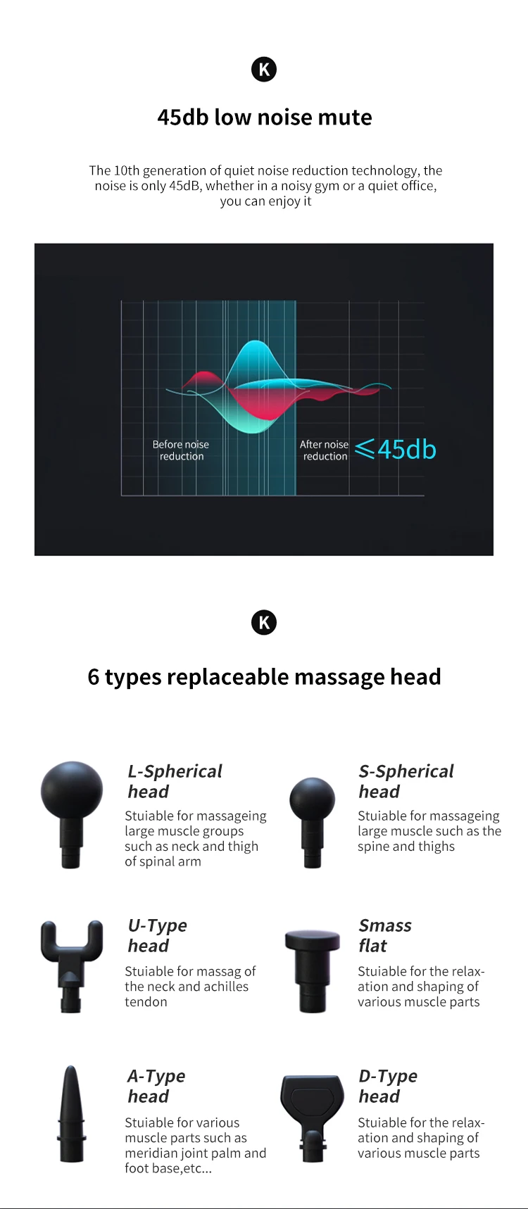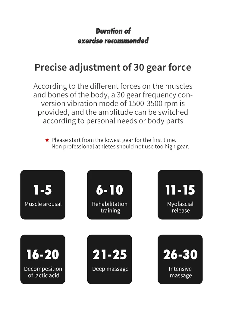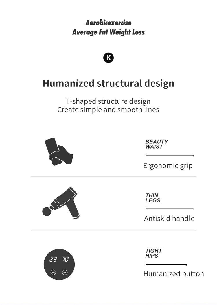 2. Шесть массажных головок и 20 массажных позиций могут удовлетворить различные потребности массажа. 10 минут таймер включения и выключения, чтобы защитить ваше здоровье научно. 3. Модный внешний вид и нескользящий анти-пот дизайн, вы можете быть уверены в использовании массажного пистолета.