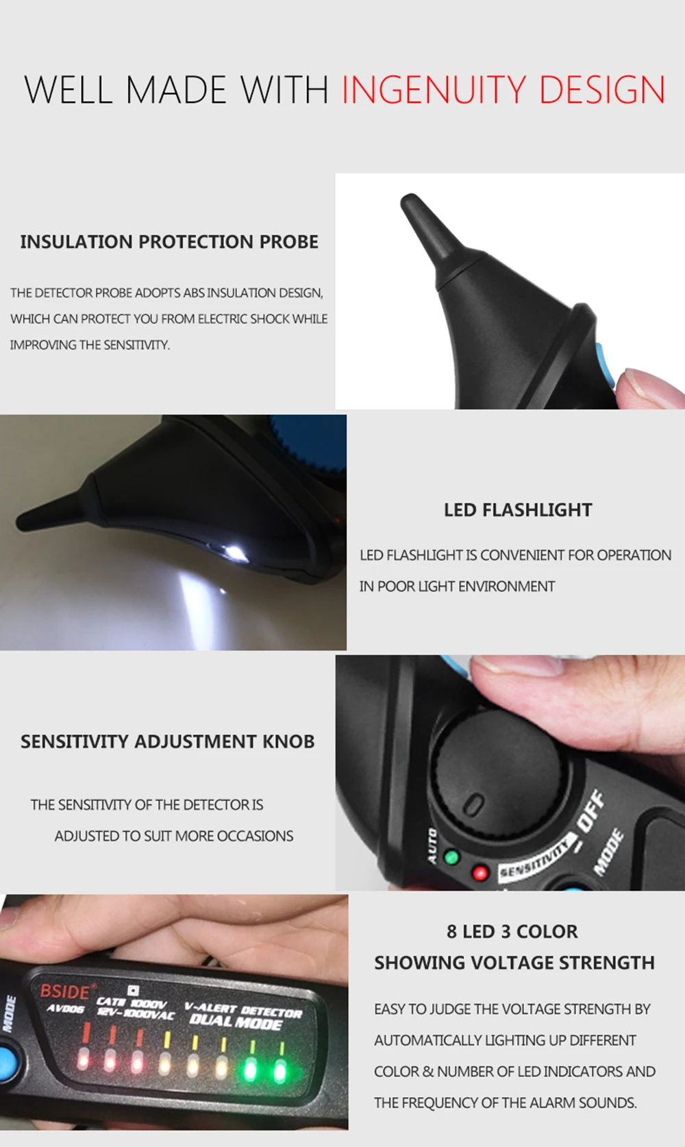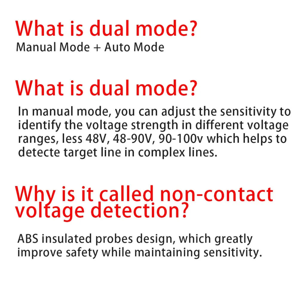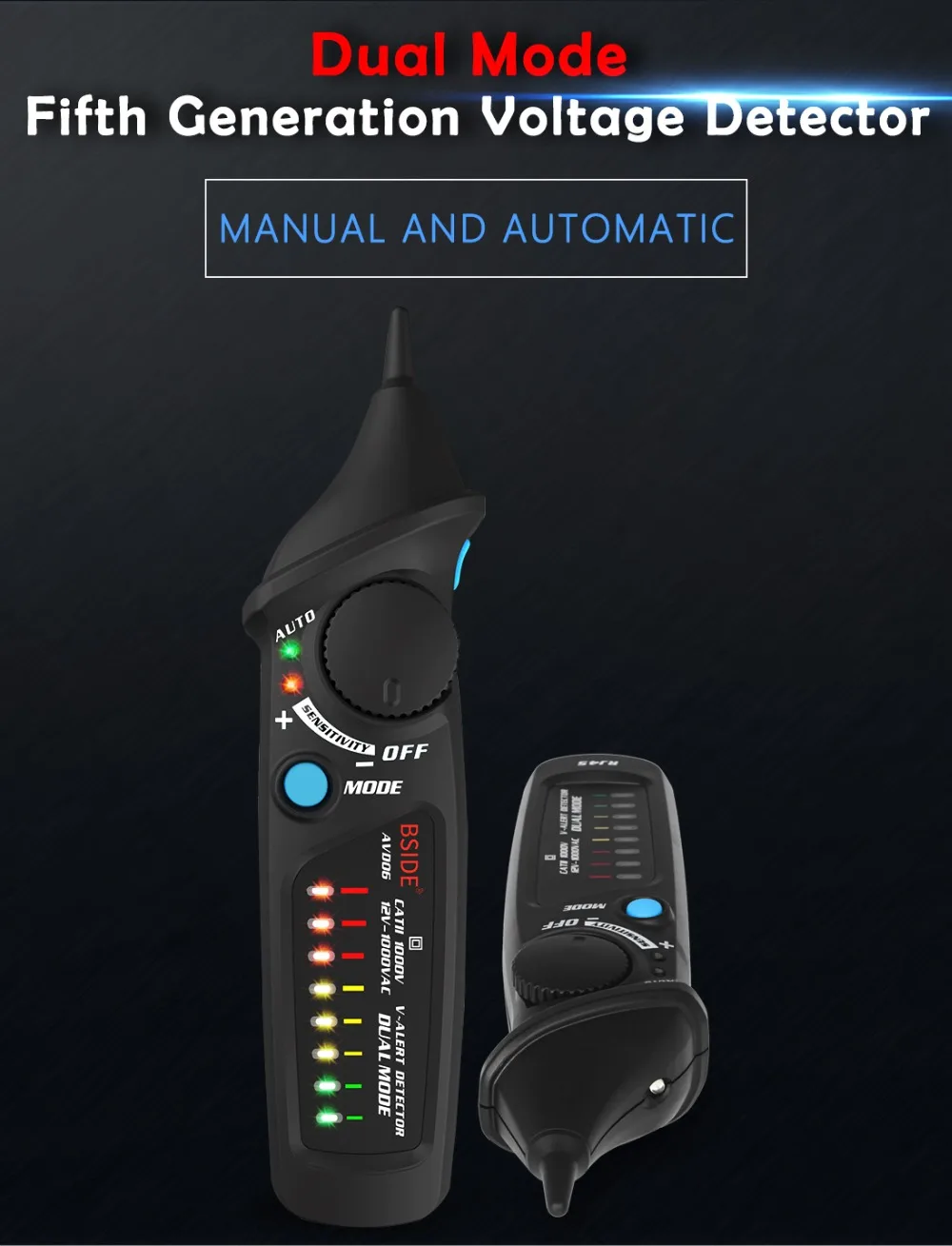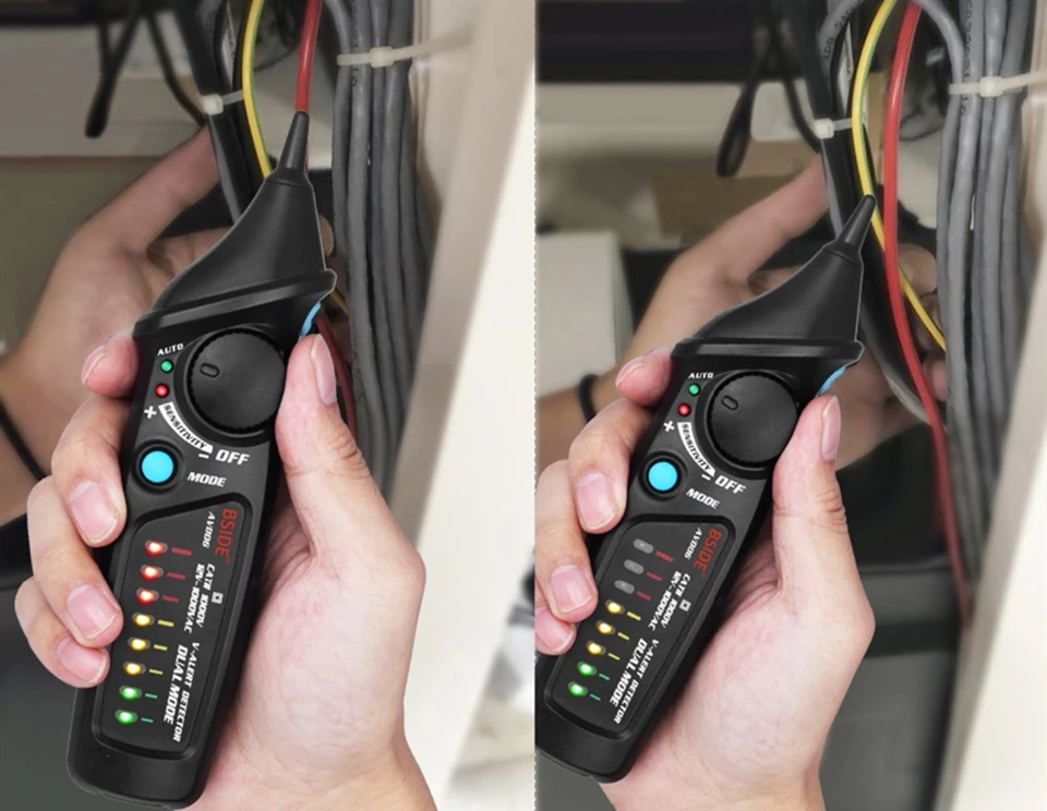 Бесконтактный светильник обнаружения напряжения переменного тока мигает и оповещает звуковой сигнал, если определить наличие напряжения переменного тока автоматический или ручной режим тестирования, чтобы выбрать спиннинг регулятора чувствительности для свободной регулировки чувствительности в ручном режиме умная Сила напряжения обнаружения: автоматический светильник зеленый, желтый, красный светодиодный Лампа, указывающая на низкий уровень, умеренное или высокое напряжение различать нулевой/живой провод в соответствии с чувствительностью удобный дизайн прожектора для легкого тестирования в темной среде Автоматическое отключение питания, если нет какой-либо операции в течение 5 минут индикация низкого заряда батареи предназначена для международный стандарт безопасности CE CAT. II 1000 V