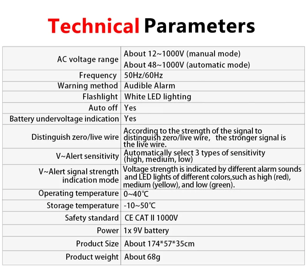 Диапазон напряжения переменного тока: 12 В ~ 1000 В (ручной режим); 48 В ~ 1000 В (автоматический режим) Частота: 50 Гц/60 Гц Мощность: 1x9 V 6F22 Батарея шт.) (не входят в комплект поставки) Размеры: 174 мм * 47 мм * 35 мм Вес: 68 г
