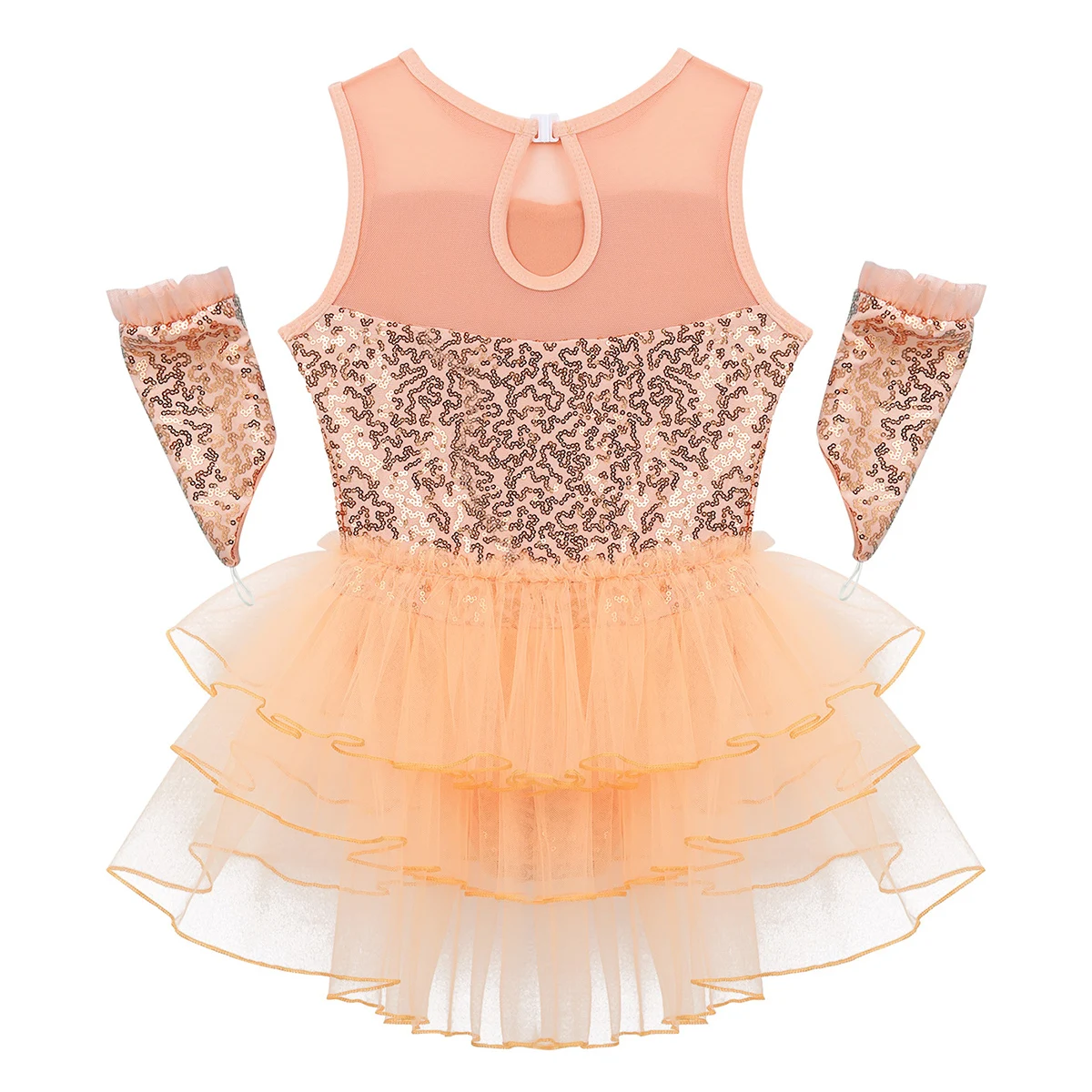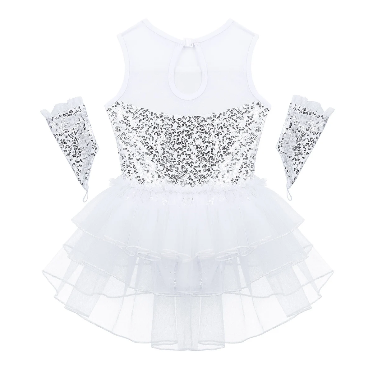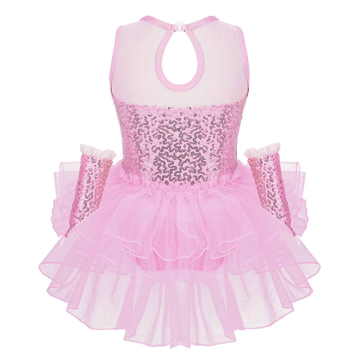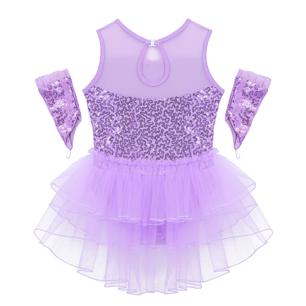 Многослойные сетчатые оборки на талии сзади. Сочетающаяся пара рукавов на запястье с эластичной петлей для пальцев. Блестящая и красивая Одежда для танцев для вашей девочки.
