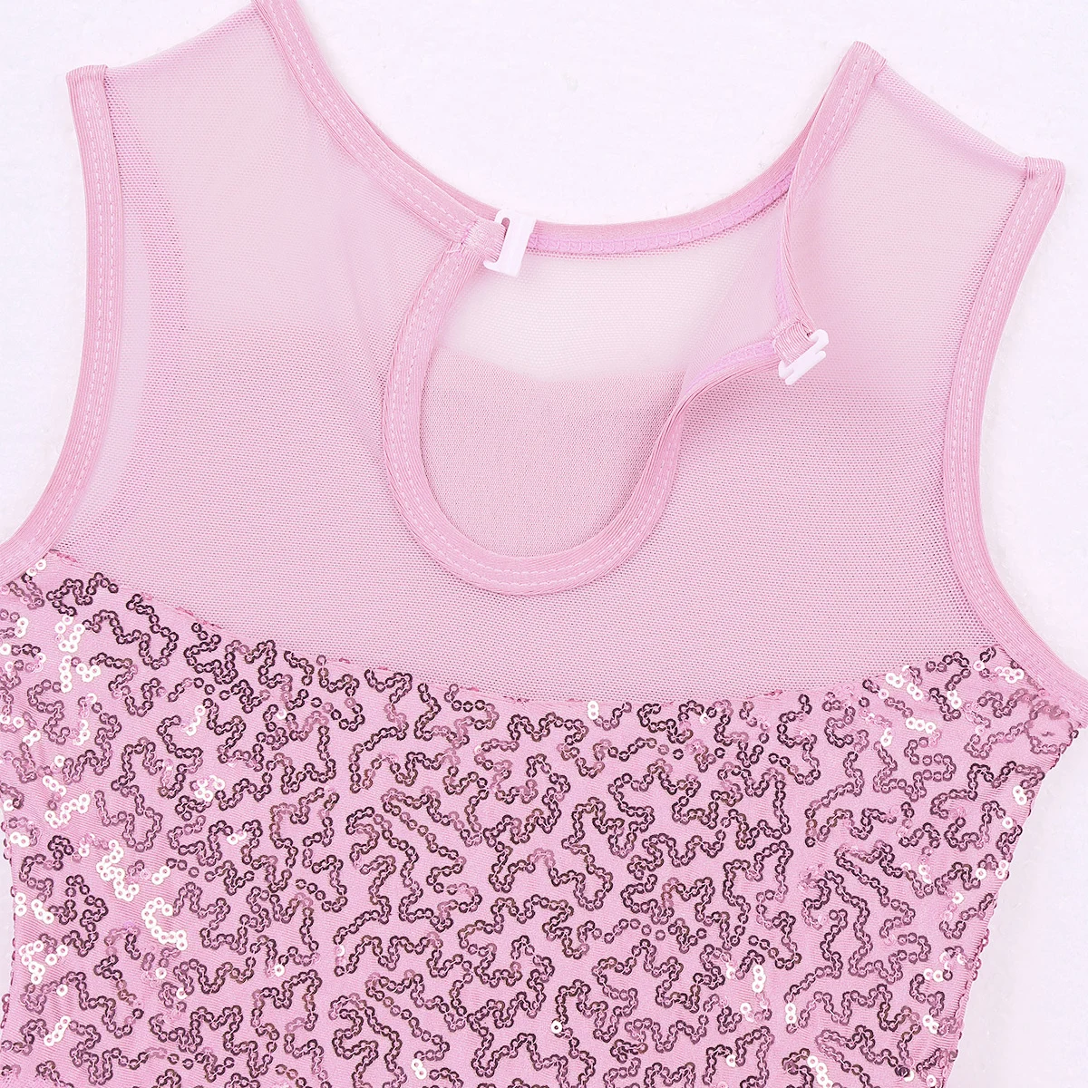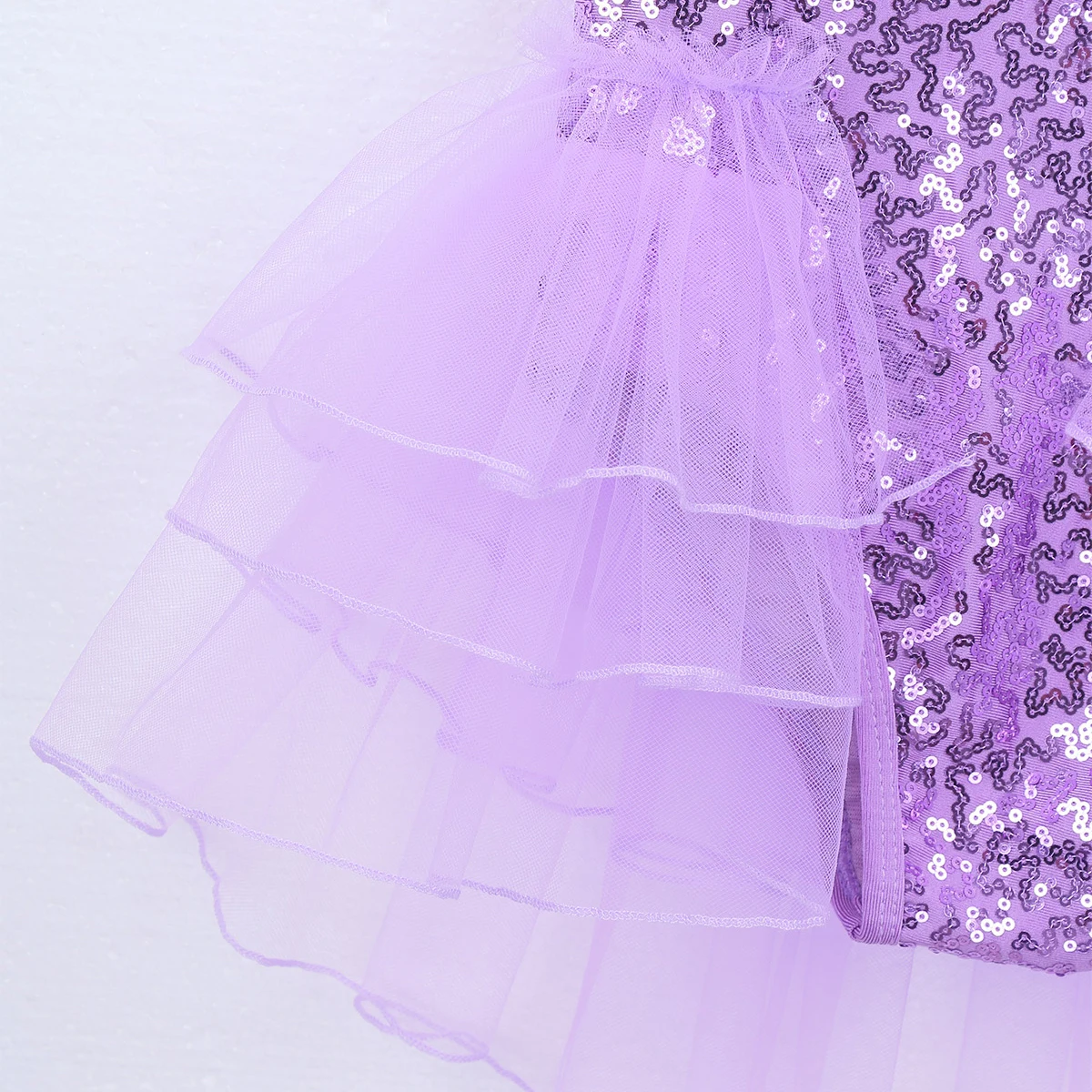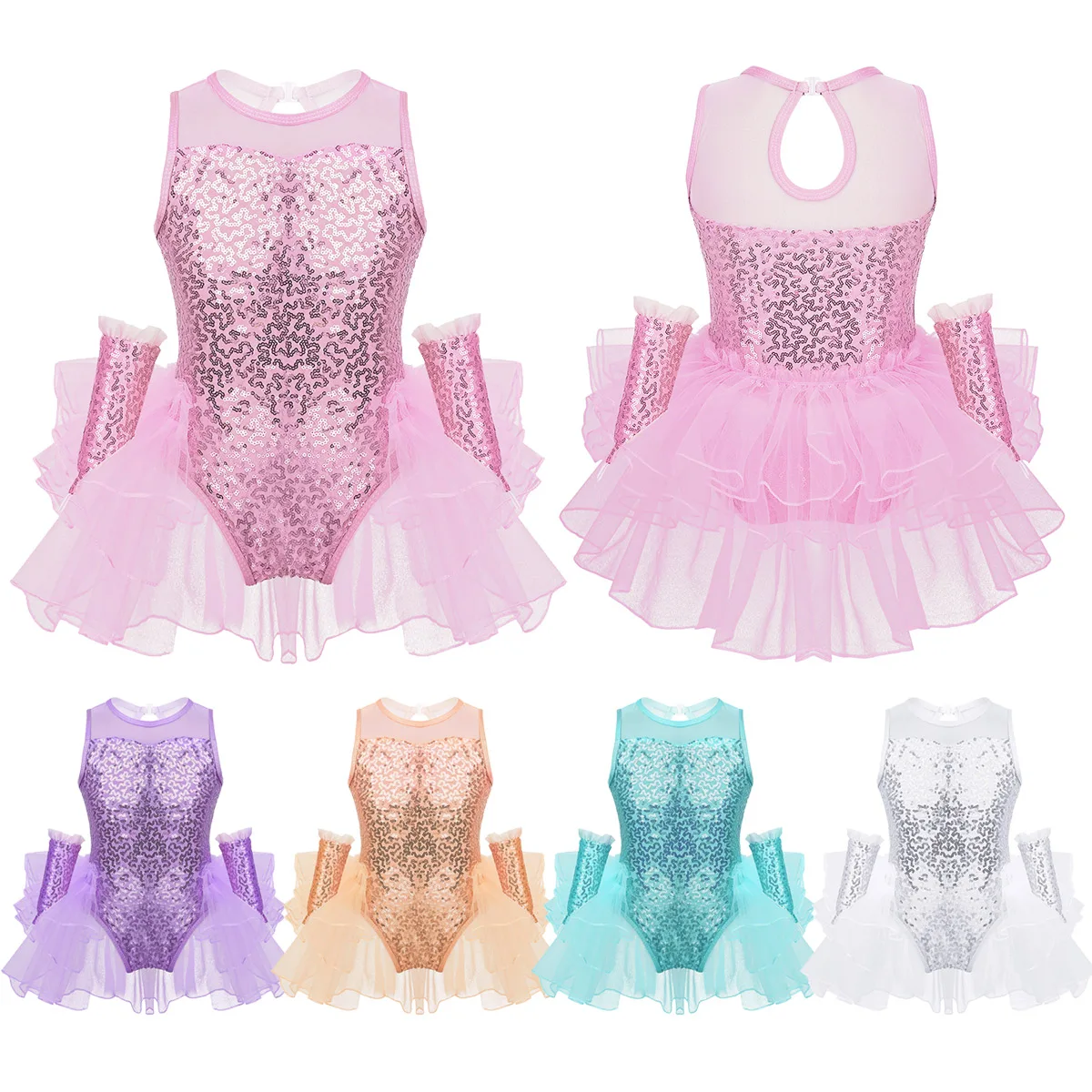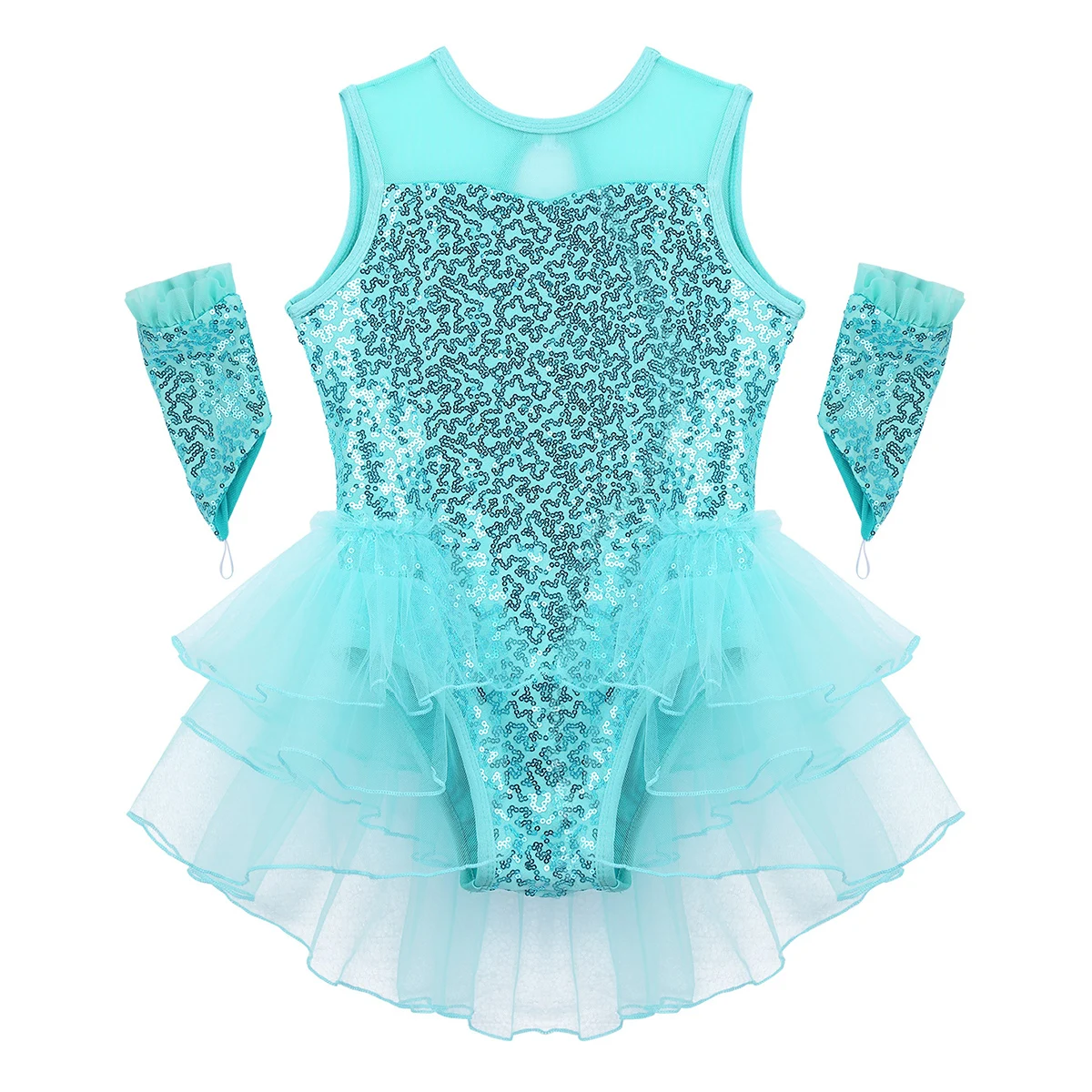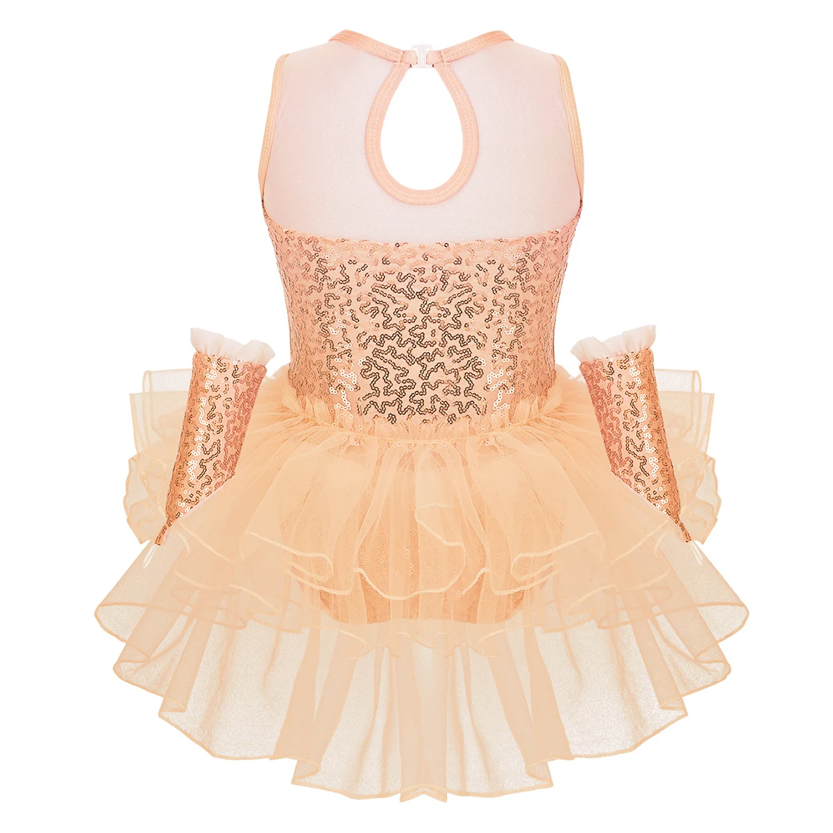 Многослойные сетчатые оборки на талии сзади. Сочетающаяся пара рукавов на запястье с эластичной петлей для пальцев. Блестящая и красивая Одежда для танцев для вашей девочки.