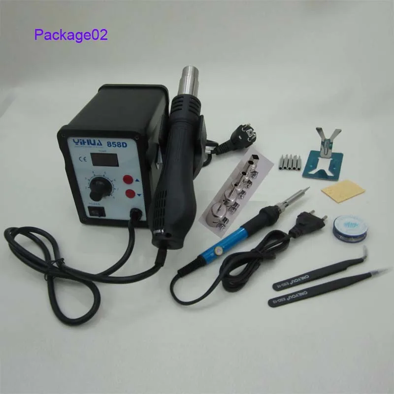 Package02 including: 1) 1 x 220V Hot Air Rework Station with EU plug 4 x Nozzle(not including the 3mm one) 1 x Plastic bracket 1 x Double-headed Screwdriver (Length: 12cm, for free) 1 x Instruction Book 2) 1 x 60W Soldering Iron ( EU plug 220V ) 3) 2 x Tweezers (fine tips curved,fine tips straight) 4) 1 x Solder Wire (Dia: 0.8 mm, N.T: 11 grams) 5) 5 x Soldering iron tip (I / K / B / 3C / 2.4D) 6) 1 x Soldering Iron Stand(With sponge, Y-type, 5.0 x 8.0cm)
