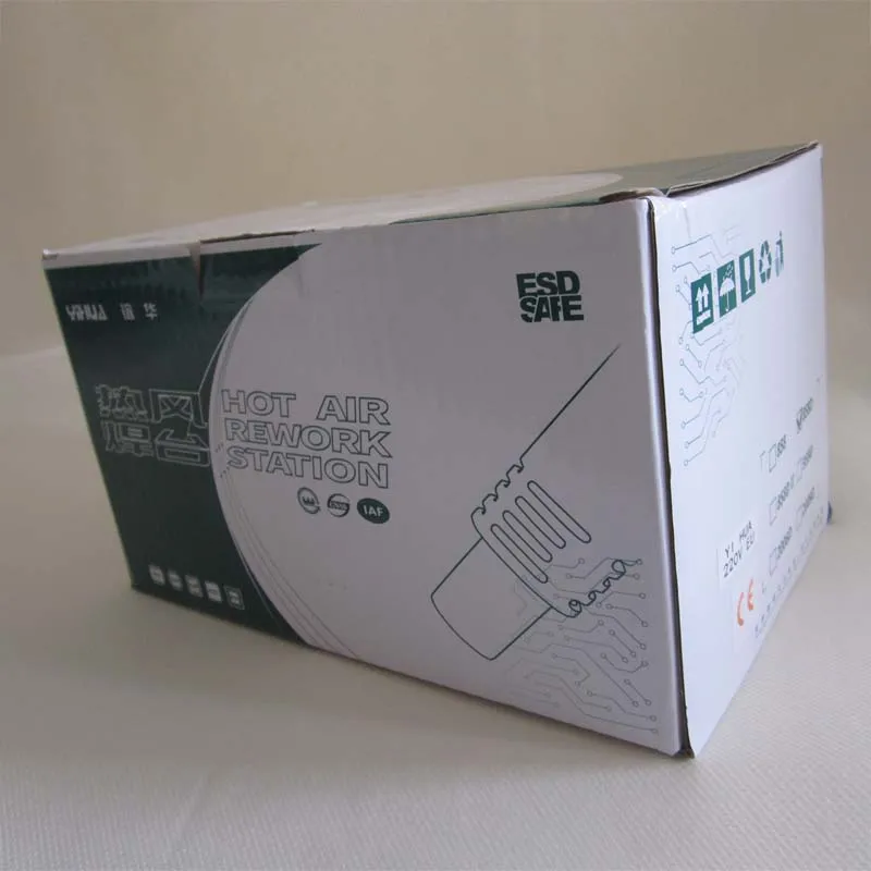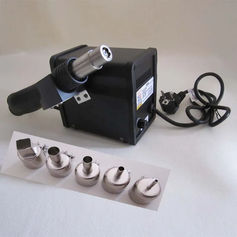 Hot Air Gun Specification Input voltage: 220V Output Power: 650W Temperature range: 100~500 Celsius Degree Display mode: Microcomputer digital LED (Resolution rate: 1 Celsius Degree Airflow type: Brushless-Motor Fan Airflow: 120L/min(MAX.) Net Weight : 1.55Kg Noise: Less than 45db Features: 1) Closed circuit Sensor, microcomputer zero-crossing soft touch temperature control, LED visual display, high power, rapid rise of temperature, accurate and stable temperature, little influence of air soldering, without lead. 2) Adjustable air flow, large and soft air flow, easy adjustment of temperature, suitable for multiple usages. 3) Hand handle with sensor switch, the system will turn into the working mode while the handle is held; and the system will standby while the handle is put on the holder, which is very convenient for operation. 4) Automatic cooling function of the system will prolong the life of heating element, and protect the hot air gun. 5) Double efficiency at the same power of the Brushless fan with long lifetime, low noise; high quality heating element and with good quality heating wire will prolong its life and save energy. 6) It is equipped with digital correction temperature function. 7) It is equipped with Celsius/Fahrenheit display temperature function. Usage 1. Suitable for unsoldering multiple components, such as SOIC, CHIP, QFP, PLCC and BGA, etc (especially for flat cables and cable connectors). 2. Shrinking, Paint drying, adhesive removal, thawing, warming, Plastic welding.
