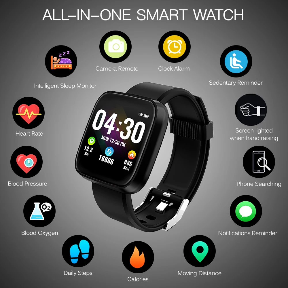 Умные часы «Все в одном»: трекер активности в течение всего дня, пульс, кровяное давление, кровяное кислород, уведомления, напоминание о сидячем положении, интеллектуальный монитор сна, будильник, пульт дистанционного управления камерой, напоминание о малоподвижности и поиск часов и т. Д.