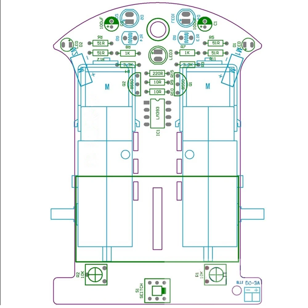 LM393 сравнивает два светочувствительных сопротивления, когда Дисбаланс (например, боковое давление на подиуме черного цвета) немедленно управляет стороной двигателя, перестает вращаться, другая сторона ускорения вращения двигателя, так что направление модификации автомобиля, вернитесь в правильное направление, весь процесс-замкнутый цикл, поэтому быстрое и чувствительное управление. В целях упрощения сложного принципа, мы сначала имеем цифровую схему для интеллектуальной слежения автомобиля, в процессе сборки, мы могли бы не только постепенно ознакомиться с механическим принципом: фотоэлемент, Компаратор напряжения, цепь привода двигателя и другие связанные электронные знания. Светочувствительное устройство сопротивления Это светочувствительное сопротивление, оно может определять внешнюю интенсивность света, чем сильнее внешсветильник, тем меньше сопротивление фоточувствительности, более слабое сопротивление внешсветильник увеличивается, когда красный светодиодный ОД проецируется на белую и черную взлетно-посадочную полосу из-за разной скорости отражения, Значение сопротивления светочувствительного сопротивления будет иметь очевидную разницу для последующего управления цепью. Интегральная схема компаратора LM393 LM393-это интегральная схема компаратора двойного напряжения, которая состоит из двух независимых прецизионных компараторов напряжения. Его роль-сравнение двух входных напряжений, в зависимости от уровня двух входных напряжений, изменение уровня выходного напряжения. Выход имеет два состояния: близко к открытию или близко к низкому уровню, LM393 с открытым выходом коллектора, поэтому необходимо добавить сопротивление тяге для вывода высокого уровня. Двигатель постоянного тока с редуктором Привод двигателя постоянного тока. Автомобиль должен замедлиться, в противном случае, чтобы ускорить работу автомобиля, он не может управляться слишком быстро, а крутящий момент замедления слишком мал и не может запуститься. Мы специализируемся на таможне этого типа двигателя, интегрирован с редуктором и значительно снижает трудности производства, что очень подходит для нашего использования. LM393 сравнивает два светочувствительных сопротивления, когда Дисбаланс (например, боковое давление на подиуме черного цвета) немедленно управляет стороной двигателя, перестает вращаться, другая сторона ускорения вращения двигателя, так что направление модификации автомобиля, вернитесь в правильное направление, весь процесс-замкнутый цикл, поэтому быстрое и чувствительное управление. Этапы сборки: Первый шаг: часть цепи базовой сварки Деталь сварочной цепи относительно проста, последовательность сварки в соответствии с высотой элемента от низкого до высокого, первые 8 сопротивлений сварки, сварка должна использовать мультиметр, чтобы подтвердить, является ли правильное сварочное сопротивление, полярные компоненты, такие как транзисторы, зеленые огни, Определенно четкая полярность электролитического конденсатора в качестве эталонного элемента мы Сварка фото, сварочный конденсатор короткий-Это отрицательная сторона вставного штифта печатной платы трафаретная печать тени, зеленый сваросветодиодный светодиод Примечание длинный штифт положительный, И сварка не слишком длинная или легко плохая, D4 D5 R13 R14 мож