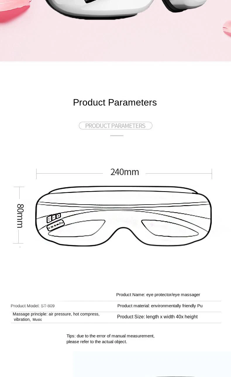 Этот продукт использует технологию микрокомпьютерного управления инфракрасным нагревом, чтобы помочь мышцам глаз заниматься здоровьем благодаря действию горячего сжатия, вибрации и давления на глаза; воздушные манжеты в части продукта вызваны инфляцией и отказом от мышц глаз. Подвижные массажные упражнения; В то же время с ролью внутреннего вибромотора и дальним инфракрасным нагревом, многогранный массажный эффект на мышцы вокруг глаз.