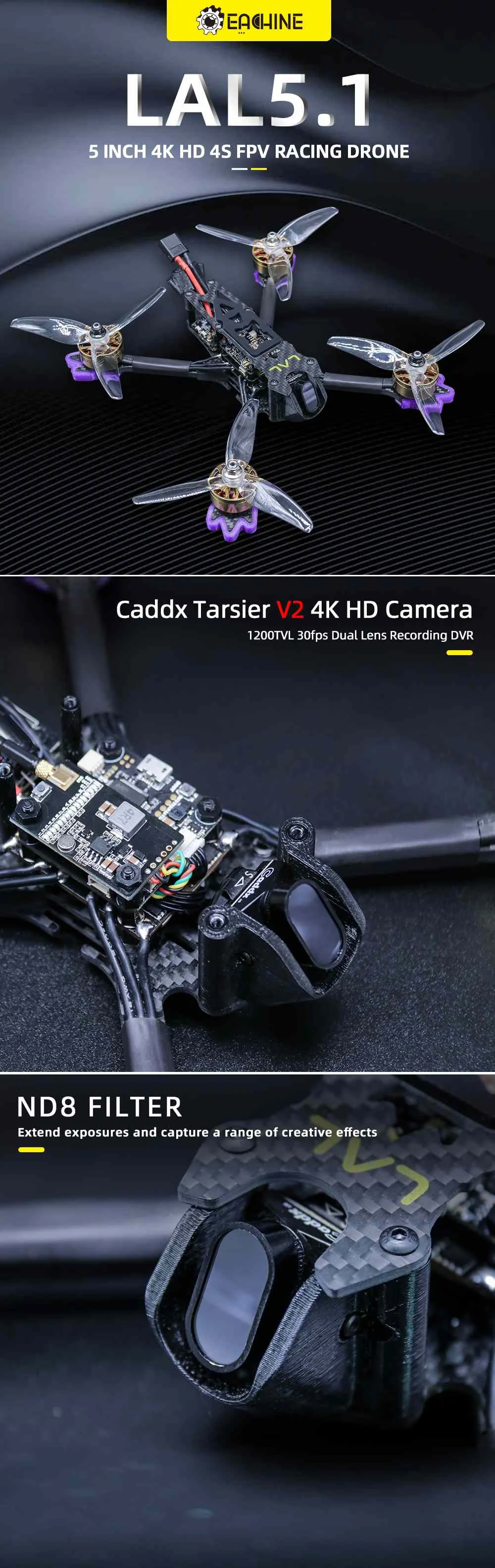 Eachine LAL5.1 225 мм 5,1 дюймов 4S PNP F405 Bluetooth Caddx Tarsier V2 Cam 2507 2600KV 50A Blheli_32 с диагональю экрана 3-6S 5,8 ГГц 25-800 МВт VTX