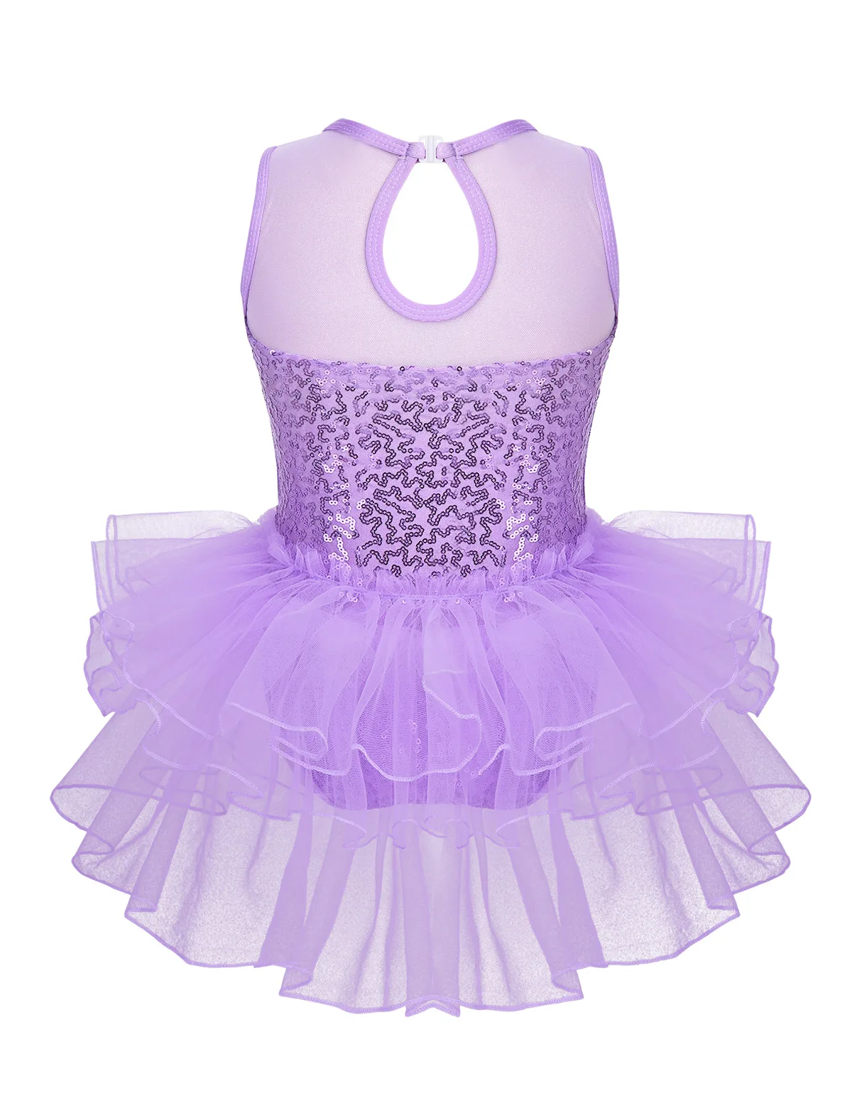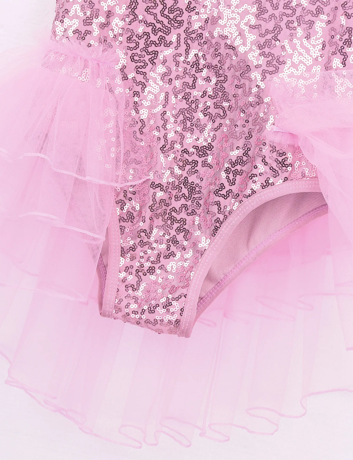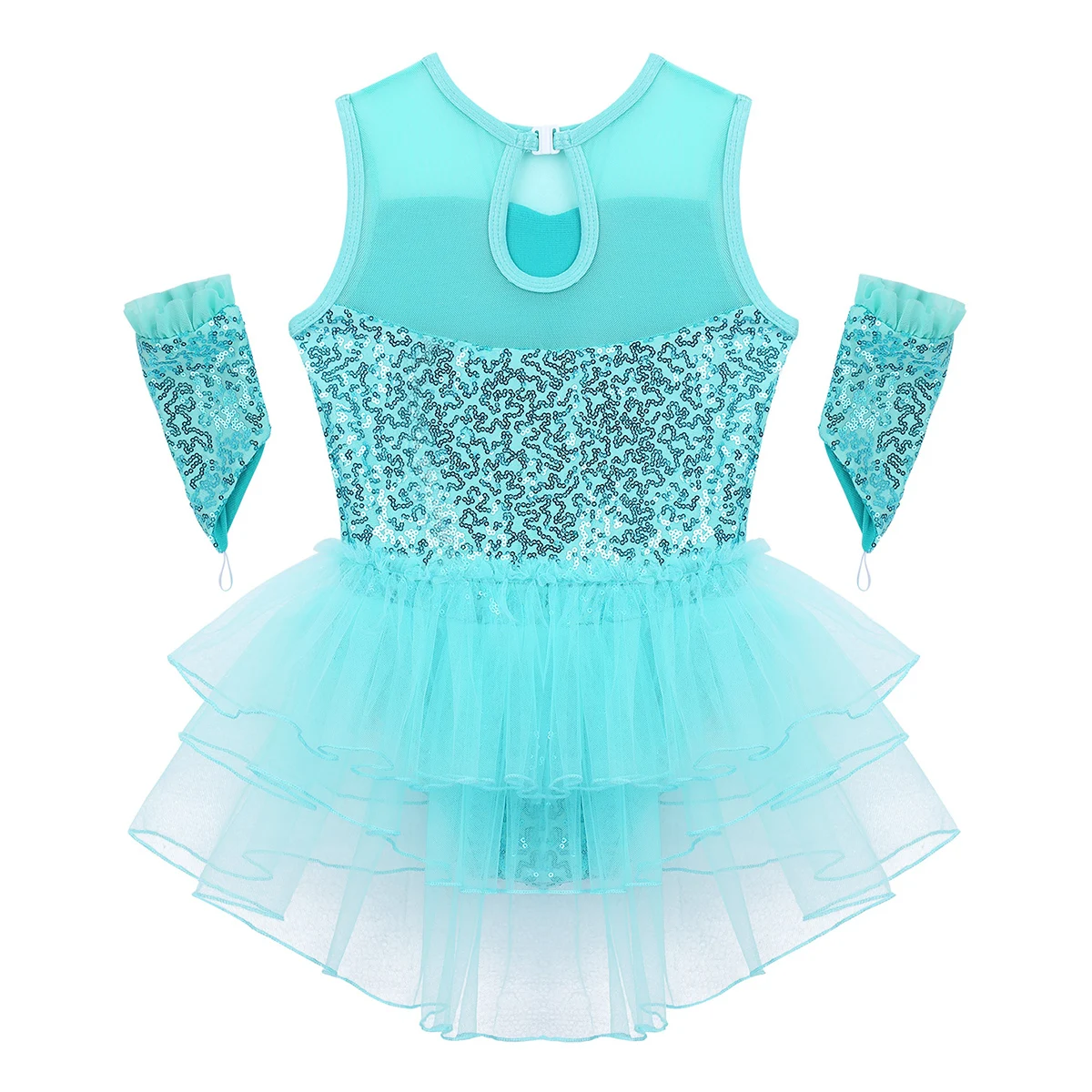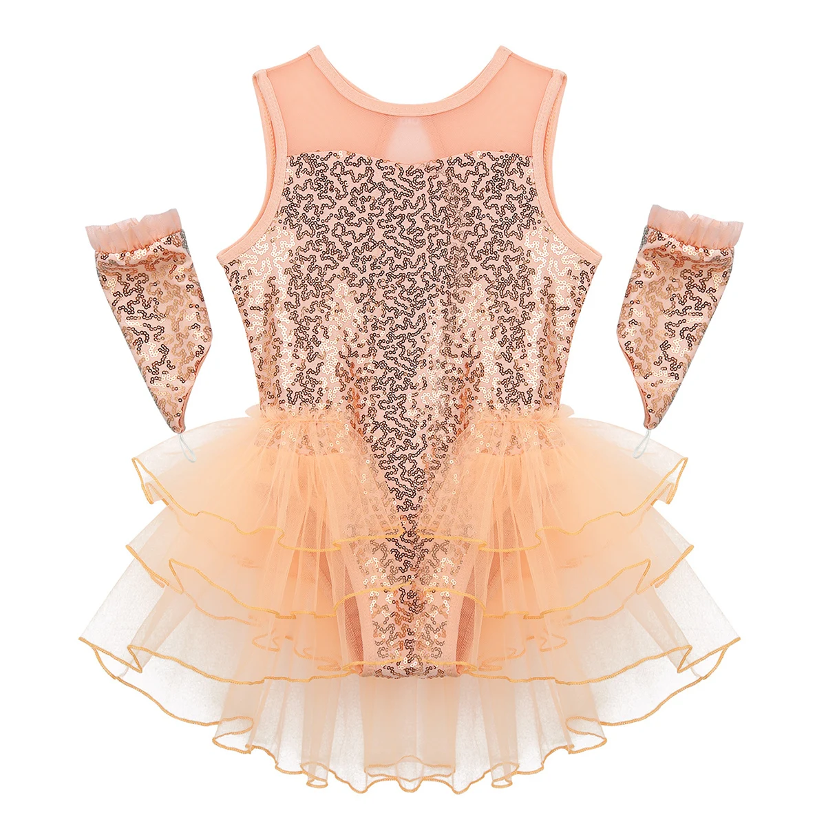 Многослойные сетчатые оборки, прикрепленные вокруг талии сзади. Подходящая пара наручных рукавов с эластичной петлей для пальцев. Блестящая и красивая танцевальная одежда для вашей девочки.