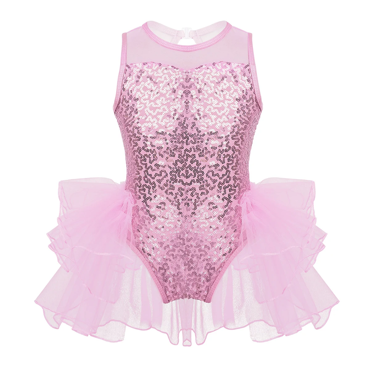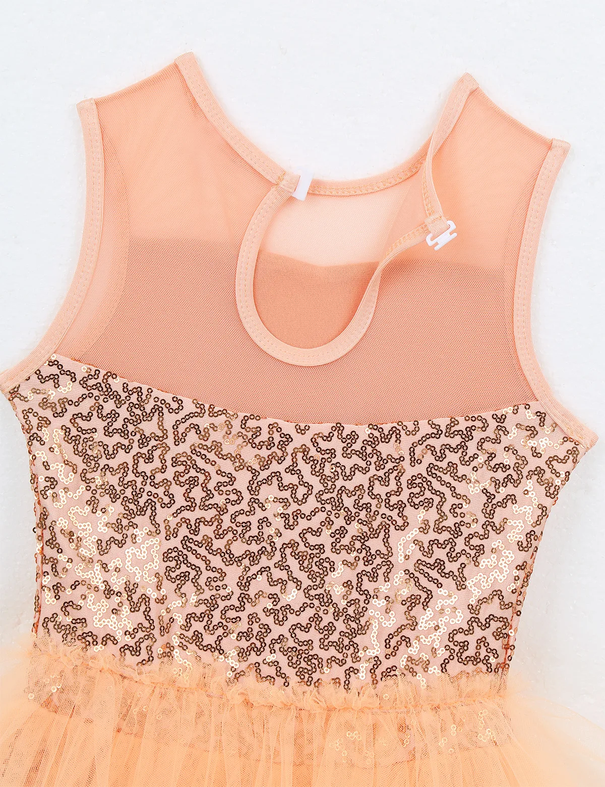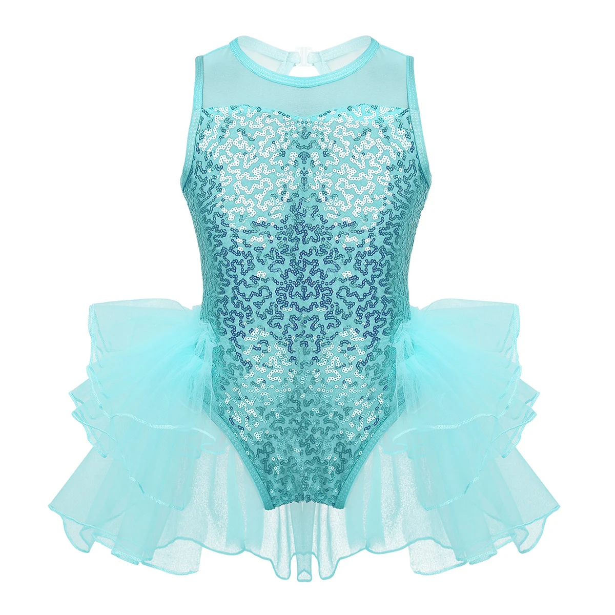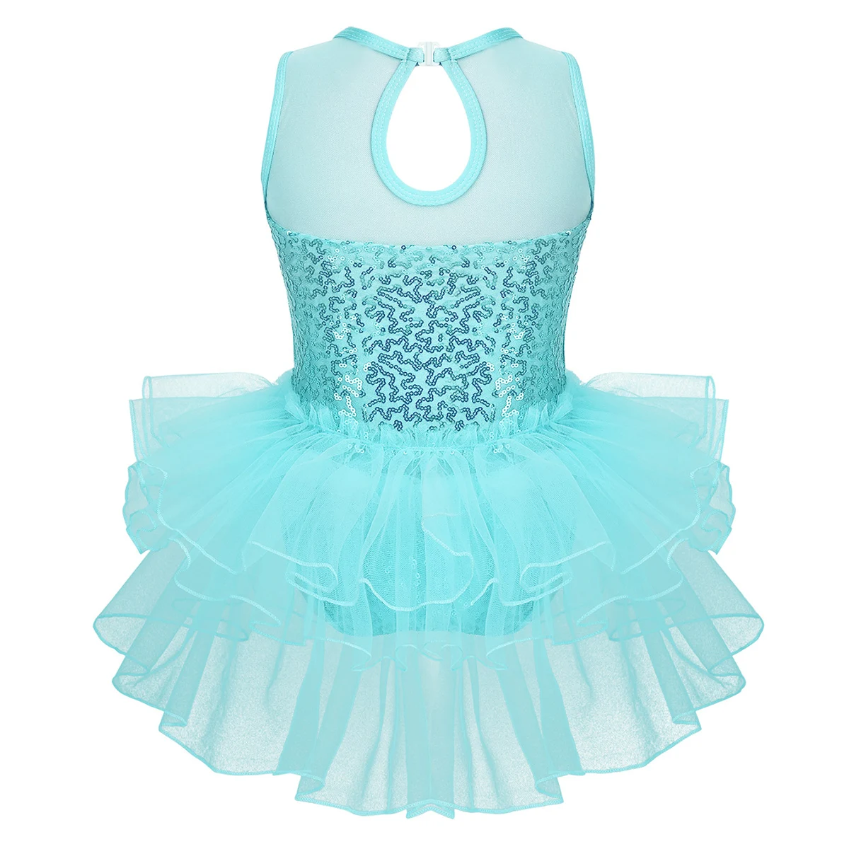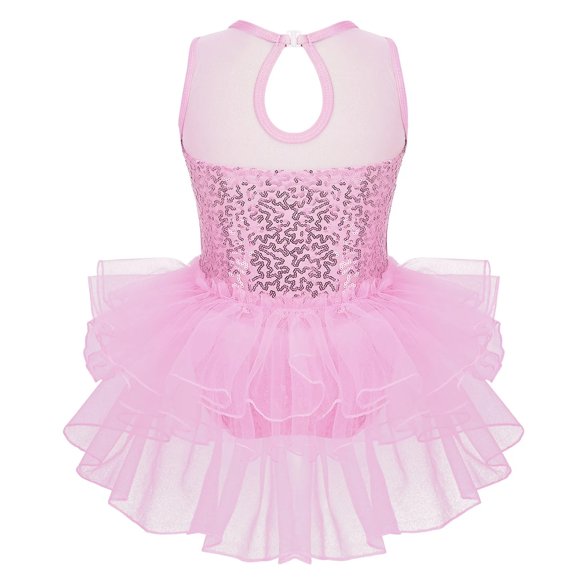 Многослойные сетчатые оборки, прикрепленные вокруг талии сзади. Подходящая пара наручных рукавов с эластичной петлей для пальцев. Блестящая и красивая танцевальная одежда для вашей девочки.