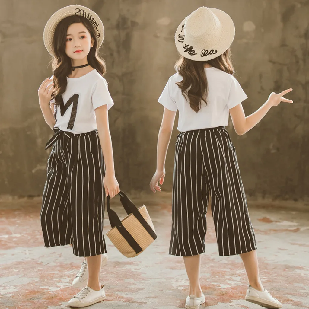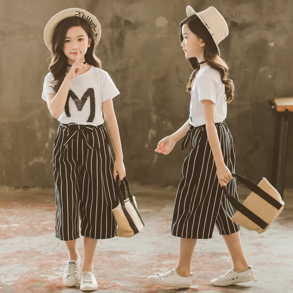 Футболка с блестками для девочек-подростков, топы с короткими рукавами, штаны в полоску, комплект одежды