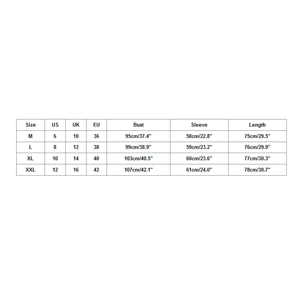 Что вы получаете: 1 шт.Для женщин топыРазмер Свяжитесь с нами Великобритания ЕС Обхват груди Рукава Длина М 6 10 36 95 см/37,4" 58 см/22,8" 75 см/29,5" L 8 12 38 99 см/38,9" 59 см/23,2" 76 см/29,9" XL 10 14 40 103 см/40,5" 60 см/23,6" 77 см/30,3" XXL 12 16 42 107 см/42,1" 61 см/24,0" 78 см/30,7"