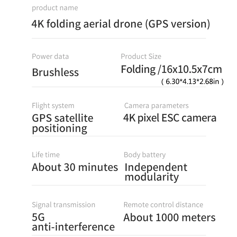 1. Регулировка угла: пульт дистанционного управления Дрон может регулировать угол камеры непрерывно вверх и вниз на 90 градусов.2. Отличная производительность: Дрон имеет широкоугольную hd-камеру 120 градусов, 4 K пикселей с разрешением 3840*2160 P, передачу в реальном времени (30 кадров/сек), передача карты Wi-Fi (200-400 м).3. Wi-fi камера: Дрон может управляться с помощью мобильного телефона или дистанционного управления фотографированием и видео.4. gps позиционирование: Дрон имеет как внутреннее позиционирование gps, так и внешнее позиционирование оптического потока для обеспечения стабильного зависания в помещении и на открытом воздухе.5. Складная конструкция: батарея дрона принимает модульный дизайн, который удобен для пользователей, чтобы приобрести замену и обеспечить долгое время полета. Дрон принимает складной дизайн, что делает хранение более удобным.Основные функции:1. Внутри позиционирование давления воздуха/позиционирование оптического потока/открытый двухрежимный gps фиксированная точка/gps возврат одной кнопки.2. Установка возврата включает в себя: возврат одной кнопкой/возврат Низкого давления/неконтролируемый возврат.3: мобильное приложение осуществляет автоматическое отслеживание/объемный/указывающий полет.Описание:Название: Бесщеточный gps-дронРазмер в сложенном виде: около 16*10,5*6,8 см/6,30*4,13*2,68 дюймовРазмер расширения: около 35,5*40,6*6,8 см/13,98*15,98*2,68 дюймовРазмер упаковки: около 27,5*20,5*10 см/10,83*8,07*3,94 дюймовВес нетто: около 1063 гВес брутто: около 1188 гРасстояние полета: около 1000 мЧастота дистанционного управления: 2,4 ГГцХарактеристики двигателя: 1806 квТип лезвия: 3-дюймовый откидная Передняя и задняя веслоВремя полета: около 25-28 минутGps: Двойной режим (gps/ГЛОНАСС)Безголовый режим: кнопка дистанционного управленияКамера: около 500 м (wifi/5G)Yuntai: Отрегулируйте угол наклона камеры вверх и вниз на 90 °Материал: АБС, оборудование, электроникаВес тела: Около 420 гДиагональная Колесная база: около 300 ммДистанционное управление: Двусторонняя передача данных/ЖК-дисплейМодель аккумулятора: 2 S 25C7. 4 V 3000 mAhЗарядка: зарядка через USB; Встроенный аккумуляторВремя зарядки: 300 минутГеомагнитный: встроенный модульЗабор: по умолчанию (высота 100 м/расстояние 250 м)Фото пикселей: 4090*3072 (4 K)Пиксель передачи изображения: 1080 P/30 кадров в секундуВидео 1920*1080Позиционирование рынка: представляем модели самолета новичку, любителю воздушного изображения.Возраст использования: старше 14 летУпаковочный лист:1 * Drone1 * Дистанционное Управление2 * резервные лопасти вентилятора1 * usb кабель для зарядки1 * отвертка1 * Инструкция по эксплуатации1 * лезвие ключ, дюймовый стандарт1 * корпус Батарея 1 * Дистанционное Батарея