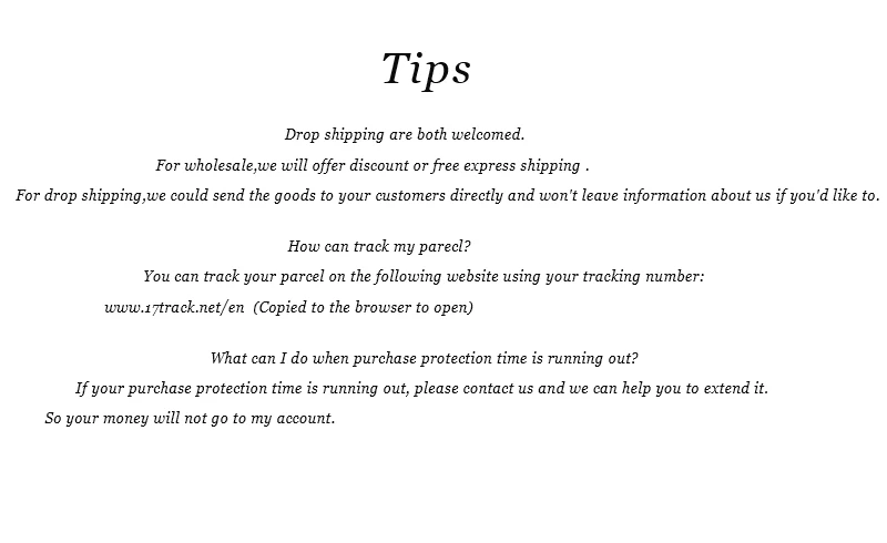 1. Размеры показаны с конкретными измерениями и являются китайскими, пожалуйста, проверьте перед размещением заказа, пожалуйста, выберите размер в соответствии с DETALL MEAAUREMENTS, а не только размер, наш размер может не соответствовать вашему стандарту. 2. Покупатели оплачивают Ввозные таможенные пошлины, налоги и сборы, которые не включены в цену товара или стоимость доставки. Мы постараемся сделать все возможное, чтобы снизить риск таможенных пошлин. 3. Предложение об акцепте: Продавец не несет ответственности за недоставку или задержку доставки заказа в случае стихийных бедствий, войн или других причин форс-мажорных обстоятельств.