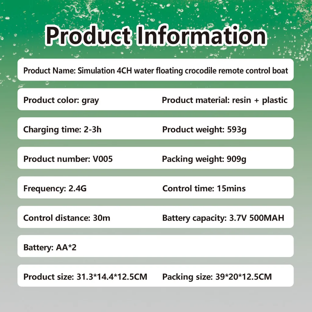 Тип изделия: имитация-голова крокодила Цвет: зеленый Материал: Plasatic + смола Время зарядки: 2-36hours Частота: 2,4G Время использования: 15 минут Пульт дистанционного управления Расстояние: 30 метров ЛодкаБатарея: 3,7 V 500 мАч (в комплекте) Аккумулятор пульта дистанционного управления: AAx2 (не входит в комплект) Размеры: 32x14.5x10.5 см/12.48x5.66x4.10" Посылка Размеры: 39x20x12.5 см/15.21x7.80x4.88 ”(1 см = 10 мм = 0,39 дюйма) Измерения деталей На прикрепленном фото.Посылка включает в себя: