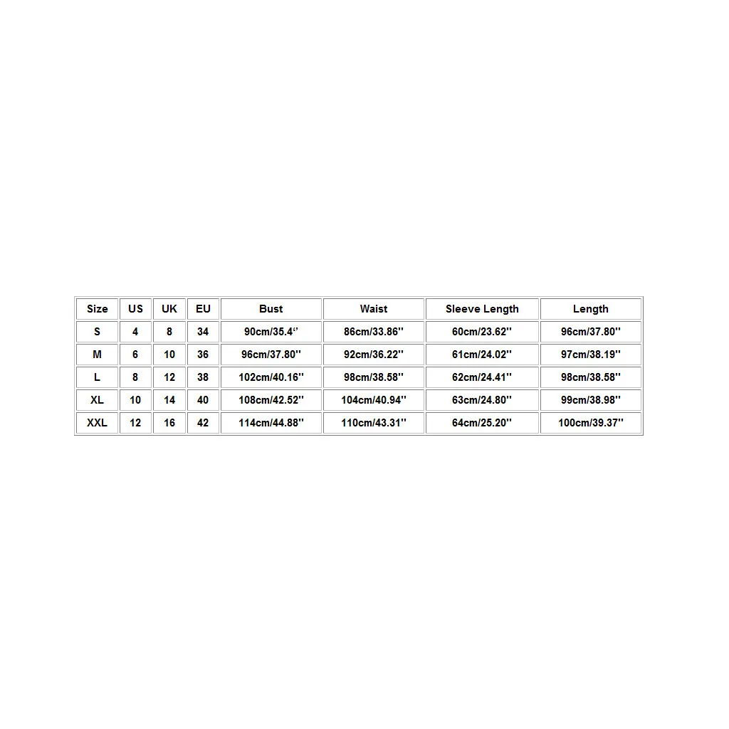 Пожалуйста, сравните детальные размеры с вашими перед покупкой!Цвета могут немного отличаться в зависимости от настроек компьютера и монитораПожалуйста, учитывайте разницу в 1-3 см из-за ручного измерения, спасибо (все измерения в см и обратите внимание, что 1 см = 0,39 дюйма)РазмерСШАВеликобританияЕСБюстТалияДлина рукаваДлинаS483490 см/35,4''86 см/33,86''60 см/23,62''96 см/37,80''М6103696 см/37,80''92 см/36,22''61 см/24,02''97 см/38,19''L81238102 см/40,16''98 см/38,58''62 см/24,41''98 см/38,58''XL101440108 см/42,52''104 см/40,94''63 см/24,80''99 см/38,98''XXL121642114 см/44,88''110 см/43,31''64 см/25,20''100 см/39,37''