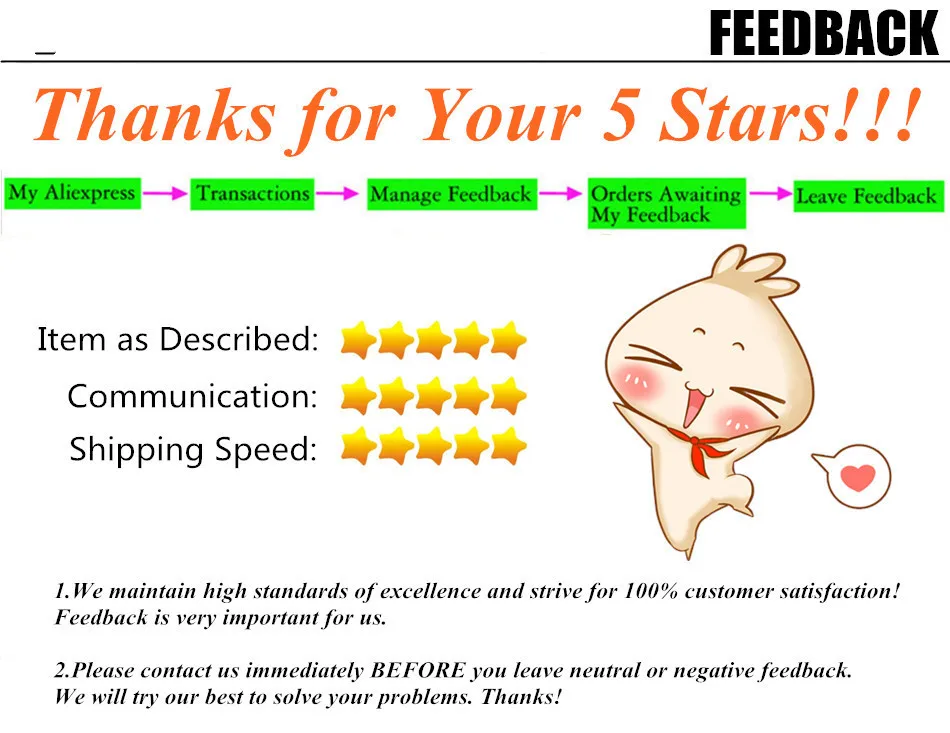 2. Не оставляйте негативные отзывы, не спрашивая нас о помощи, пожалуйста, не стесняйтесь связаться с нами, если у вас есть какие-либо проблемы. Отзывы-это наша жизнь, прежде чем оставить нейтральный или отрицательный отзывы, пожалуйста, свяжитесь с нами, чтобы получить лучшее решение, мы ответим на все сообщения как можно быстрее, заранее спасибо за ваше терпение.