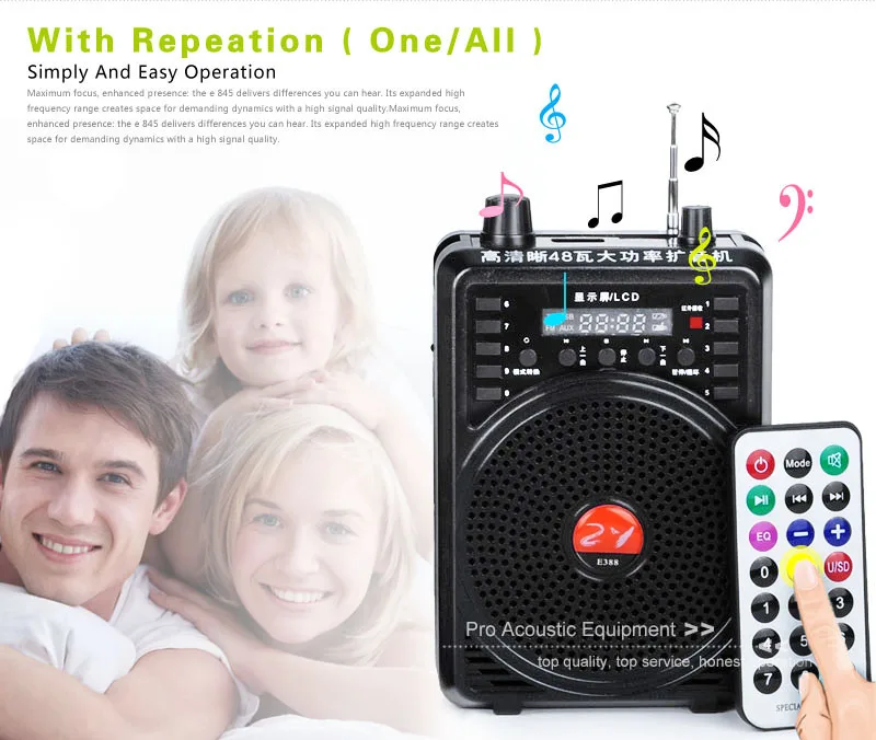 ● Профессиональная схема усиления звука, усиление звука (звук реверберации). Поддержка AUX аудиовхода, может использоваться в качестве компьютерного динамика; Поддержка tf-карты музыкальный плеер, может непосредственно воспроизводить MP3,WAV Формат аудио.