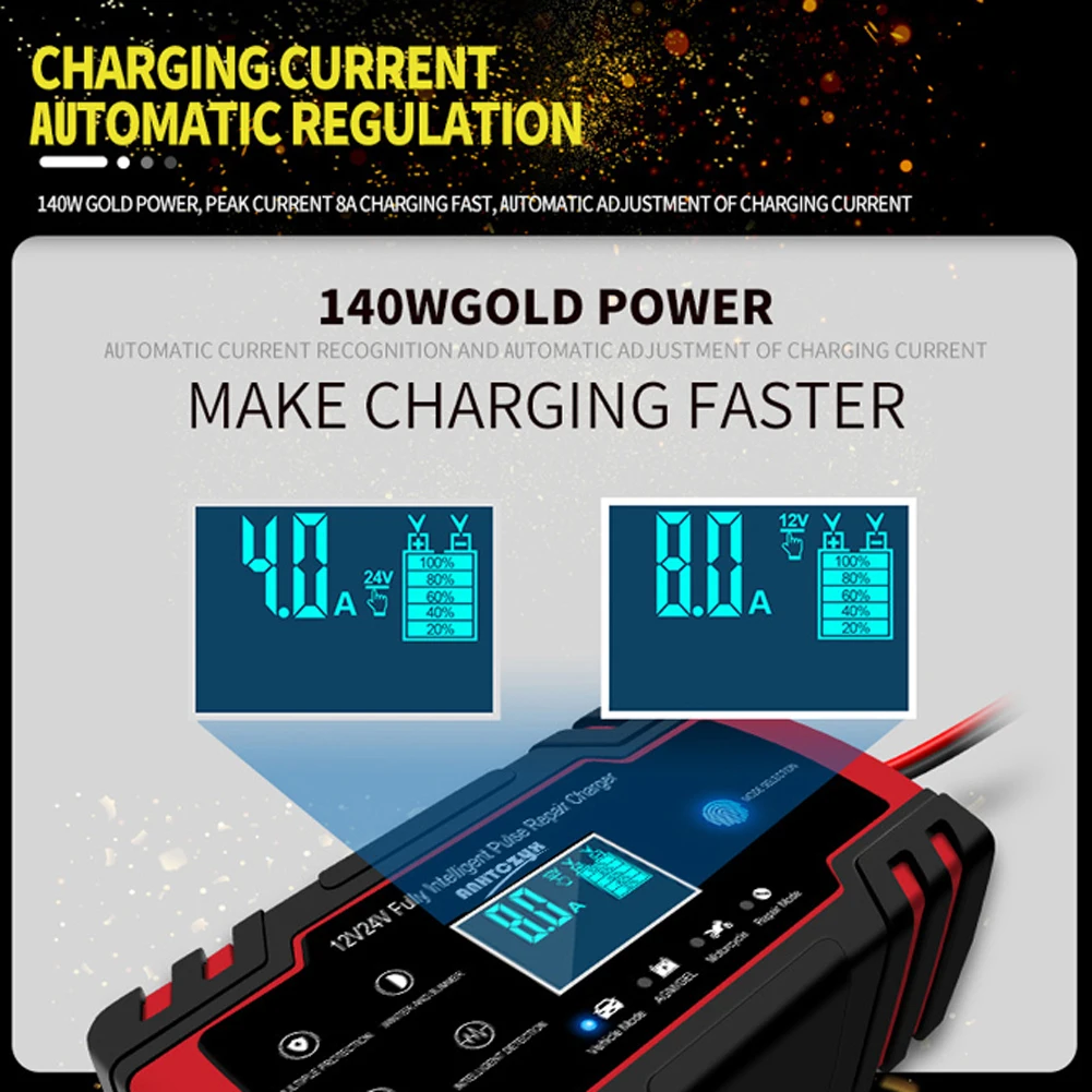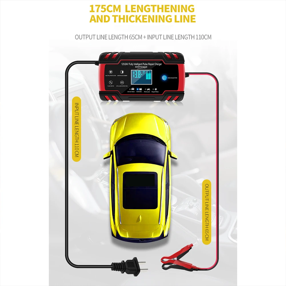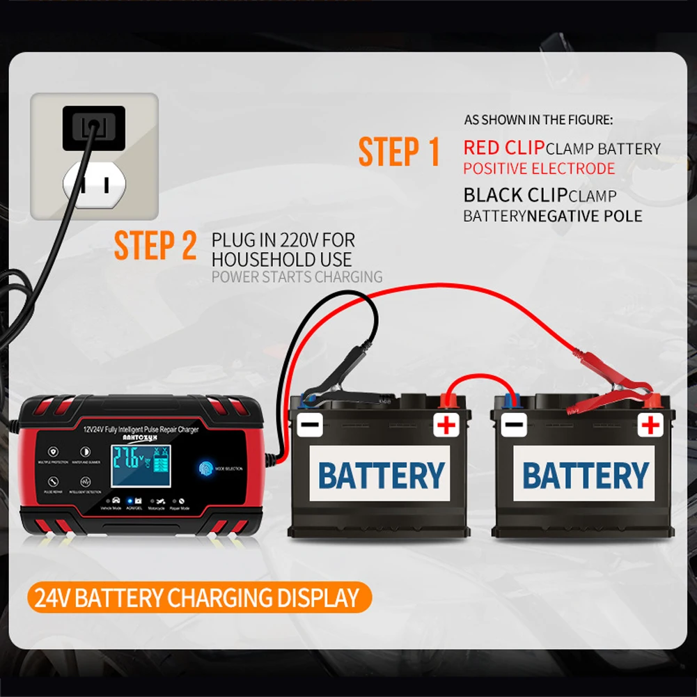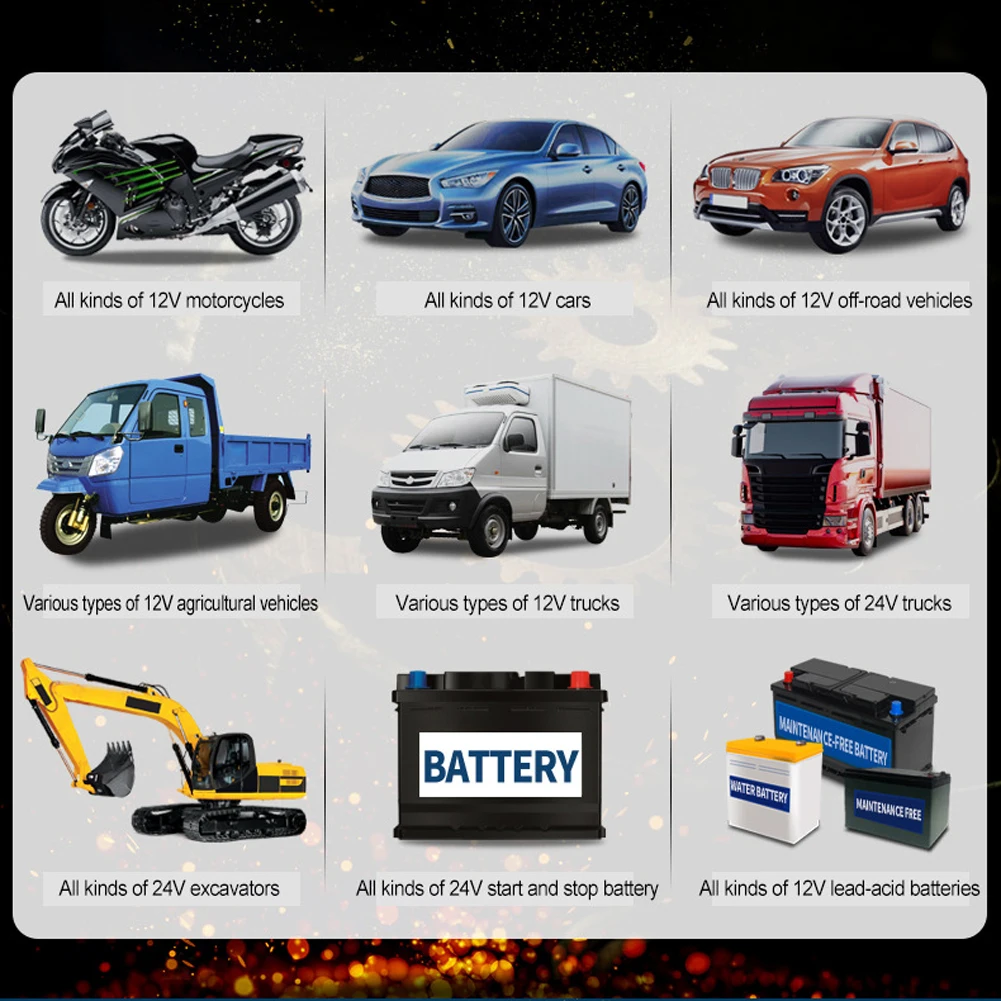 3. Это зарядное устройство предназначено для батарей 12 В и 24 В, либо оно может заряжать аккумулятор грузовика или другие автомобильные аккумуляторы, такие как автомобиль, гольф-кары, мотоцикл, газонокосилка, лодка, RV, внедорожник, ATV и многое другое. Примечание: литиевая батарея отключена