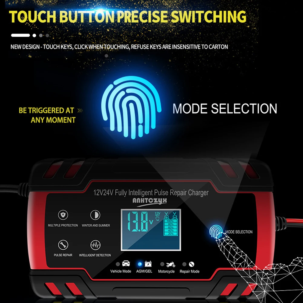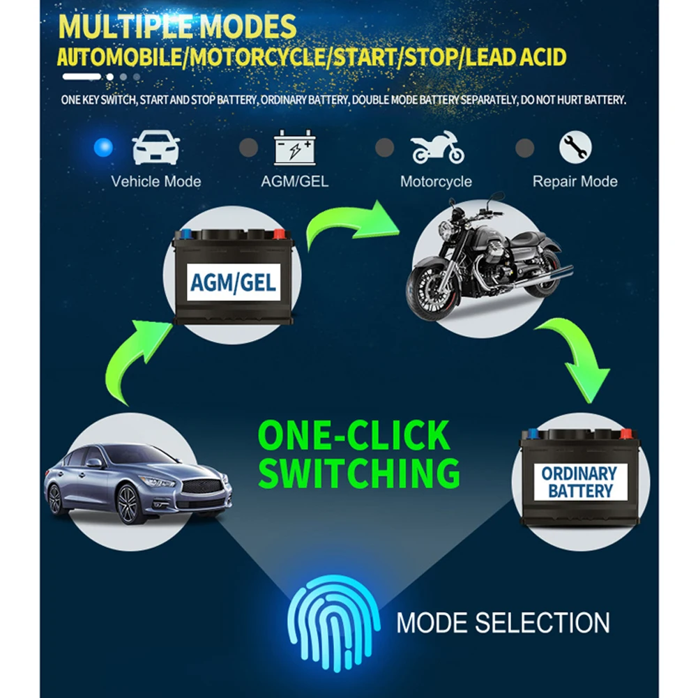 2. Он имеет 3 режима, дизайн сенсорной кнопки. При касании появляется звук нажатия, и режим автомобиля, режим мотоцикла, AGM режим, выбор режима ремонта зарядка может быть переключена в любое время, решая проблему нажатия кнопки
