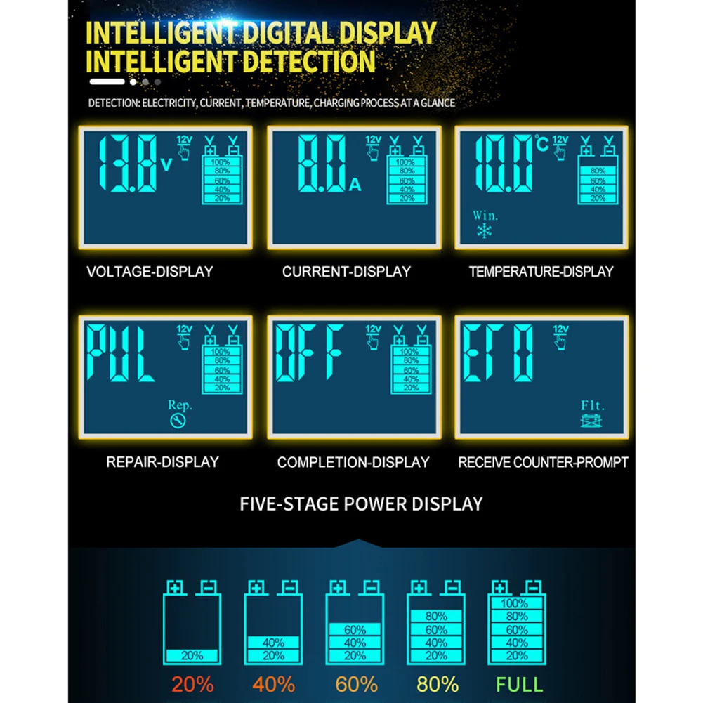4. ЖК-экран отображает состояние зарядки и состояние батареи; Автоматическое обнаружение температуры окружающей среды, и зарядное устройство может автоматически регулировать напряжение зарядки в соответствии с температурой окружающей среды