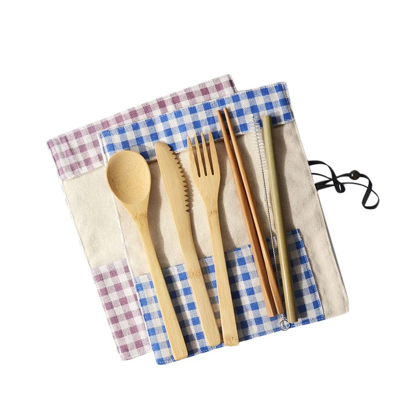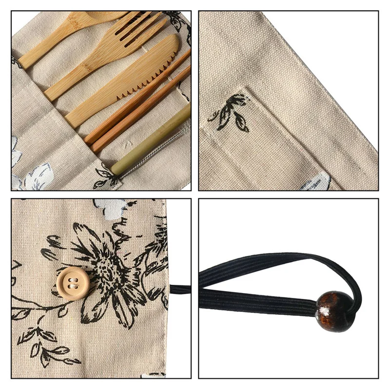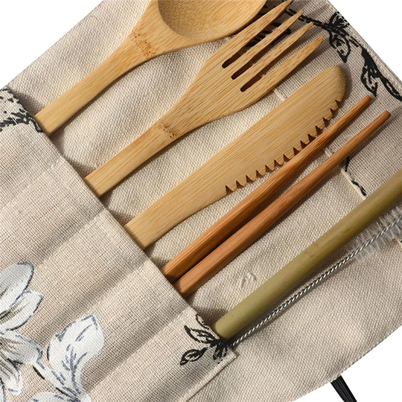 Портативные бамбуковые столовые приборы для путешествий Экологичные вилки ложки набор включает многоразовые BaMboo ломтик, FoRk, ложка, палочки для еды, солома, чистящая щетка