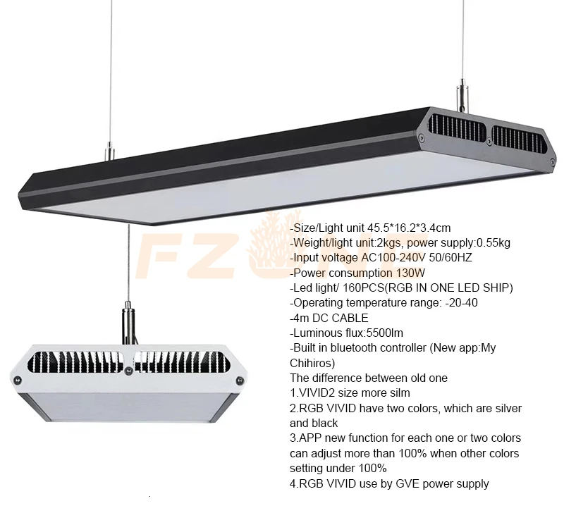 Вольт: 100 ~ 240 В во всем мире, 50 Гц/60 ГцОбщая мощность 130 Вт, 5500 люменBulit-in Bluetooth app cotroller (новое приложение: My Chihiros)Представить:Посылка включает: