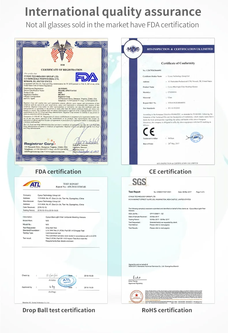 Cyxus — это профессиональный бренд защитных очков, сертифицированный Управлением по санитарному надзору за качеством пищевых продуктов и медикаментов, сертифицированный CE, протестированный компанией SGS на ограничение на использование опасных материалов в производстве, а также прошедший тест с падением стального шара на стекло компании IRC. Cyxus — это не просто очки, это наибольший комфорт для зрения в цифровую эру. Мы стремимся предоставить нашим клиентам множество товаров, удовлетворяющих требованиям качества и эффективности. Уверенно покупайте у нас товары Cyxus, так как мы являемся единственным на AliExpress официальным магазином Cyxus.