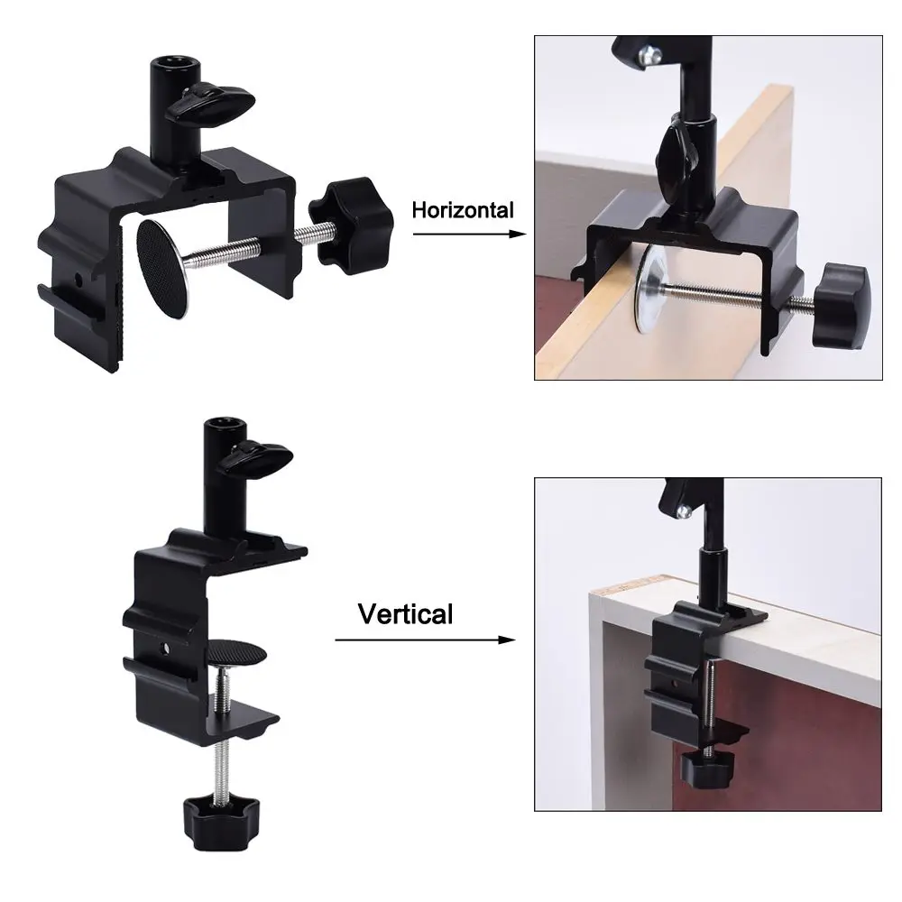 1. Прочный металлический зажим можно закрепить на любой плоской поверхности толщиной менее 2,56 дюйма/6,5 см (макс.). Он экономит место, удобно крепится к письменному столу, верстаку.