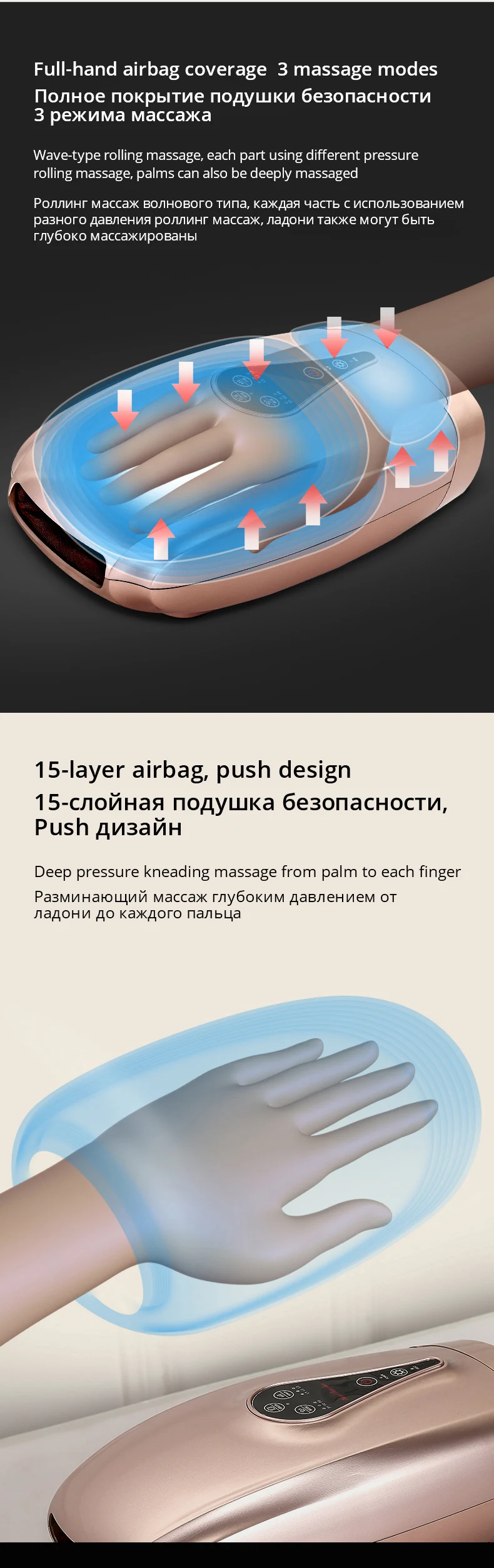 Подходит для: затекших пальцев, шелушащих рук, рук мыши, рук мобильный телефон, холодных рук, сухих рук, рук красоты Функция: нагрев/компрессия подушки безопасности/вибрационный массаж/Встроенный аккумулятор Точные параметры: 3-мя режимами массажа 3 типа интенсивности массажа 4 типа массажа подушки безопасности Вибрационный массаж Нагрева 2500 мАч батарея