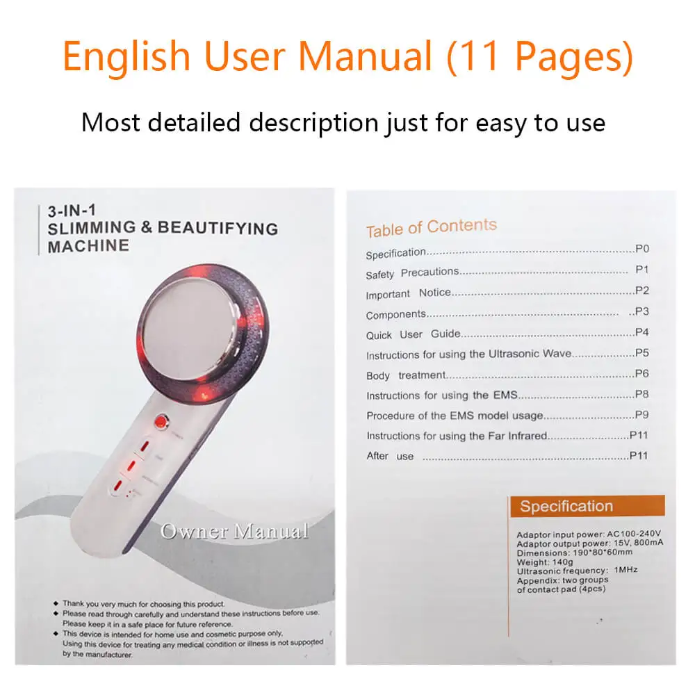 Новейшие усовершенствованные EMS + инфракрасный + Ультразвуковой Массажер средство для ухода за кожей 【 1 】 3 в 1 Вес машина потери включает в себя 3 функции: EMS + инфракрасный + Ультразвуковая частота вибрации, поможет вам сжигать жир и подтягивает кожу, более тщательно восстанавливают эластичность и активируют клетки, регулируют внутреннюю секрецию и ускоряют утомление жира. 【 2. Ультразвуковое вибрационное устройство с частотной вибрацией, может разминать жировую массу и лимбатическую детоксикацию, ускоряя обмен веществ, тем самым увеличивая потерю веса. EMS может устранить жира и лишний жир в области живота, который может повысить и укрепляют кожу. 【 3 】 EMS стимулирует мышцы с пассивным движением под микро перегрузок по току. Мышечное движение потребляет жир, сахар и углеводы окружающей ткани. EMS машина с 5 режимов: нарезание резьбы, массаж, мять, слом, цельные бесшовные трусики. 5 уровней интенсивности на ваш выбор. 【 4 】 инфракрасного масажера для имеет intrared функция обработки: Повысьте сжигание жира в организме, может восстановить эластичность и активных клетки более тщательно. Многократное использование энергии для достижения эффекта массажа и расслабления. 【 5. Простота использования дома или в поездках. Станок для похудения, подходящий на все виды кожи. Бесконтактный стальной зонд, устойчивый к окислению и прочный. Этот массажер не нагревается, но работает. --> Применение EMS с Массаж колодки: Есть 5 режимов для EMS функции, люди могут выбрать какой-либо в соответствии с указанными размерами. Рекомендуется приклеивать подушечки в соответствии с картой (используйте руководство), есть шесть функций: Подтяжка живота, Подтяжка бедер, красота талии, красота живота, красота кожи, уменьшение веса. 1. Очистите область лечения вашего тела. 2. Подключите один конец EMS провод к колодки, а другой к устройству. 3. Снимите защитную пленку с подушек, а затем приклейте прокладки на область обработки. Не перекрещивайте две прокладки. 4. Убедитесь в том, что EMS интенсивность на уровне 0. 5. Включите нажмите EMS кнопка, Выберите правильное EMS уровень на правой стороне корпуса устройства. 6. Перезагрузите EMS уровня интенсивности до 0 всякий раз, когда после использования. 7. Две накладки должна использоваться вместе в одно и то же время. Параметры: Входная мощность адаптера: AC100-240V Выходная мощность адаптера: 15 В, 800 мА Ультразвуковая частота: 1 МГц Посылка Вес: 0,6 кг Продукт Размеры: 19x8x4 см/7,5x3,2x1,6 дюймов Тип штекера: США, ЕС, Австралия, Великобритания Пожалуйста, ознакомьтесь с руководством пользователя, чтобы получить более подробную информацию Посылка включает в себя: 1x3in1 EMS + инфракрасный + ультразвуковой сварочный аппарат Адаптер питания-1 шт. 1 x EMS кабель 4 шт., контактные прокладки 1 x Руководство пользователя на английском языке 1 х толстая или тонкая коробка