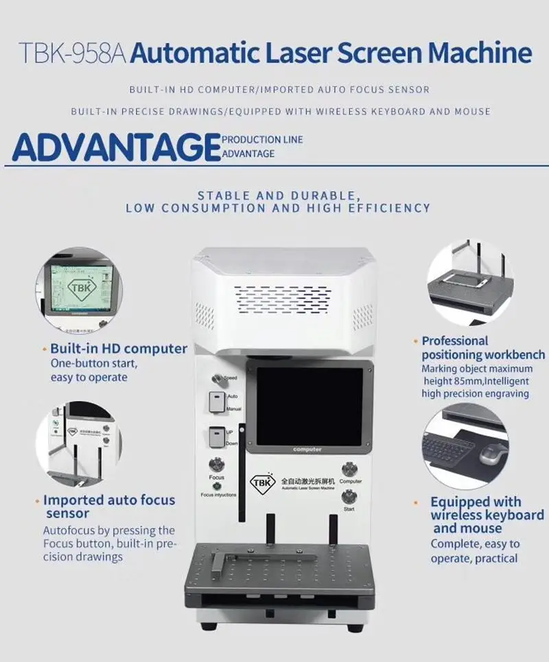 Эта машина является новейшей версией, она используется дляМобильный телефон заднее устройство для снятия стекла, лазерной гравировки и маркировки,Встроенный компьютер и точный рисунок.
