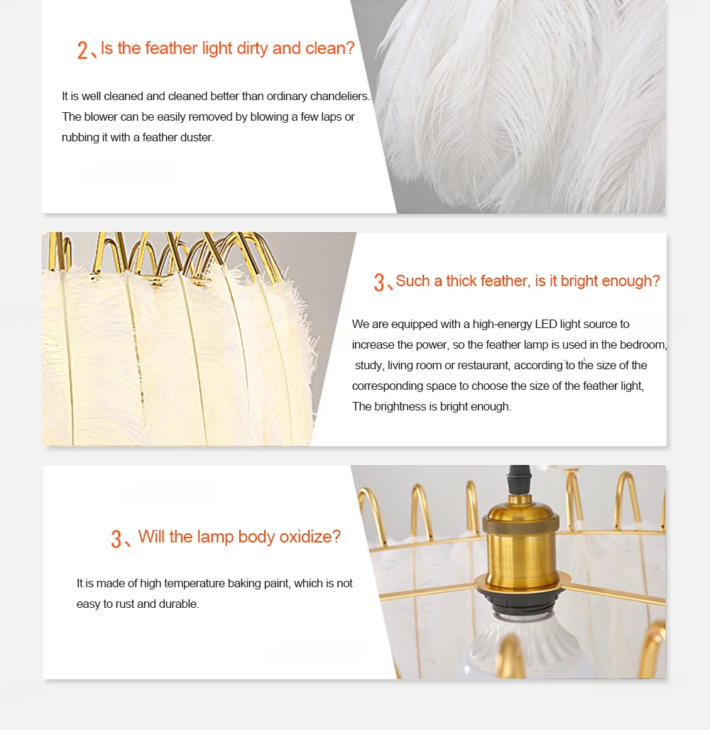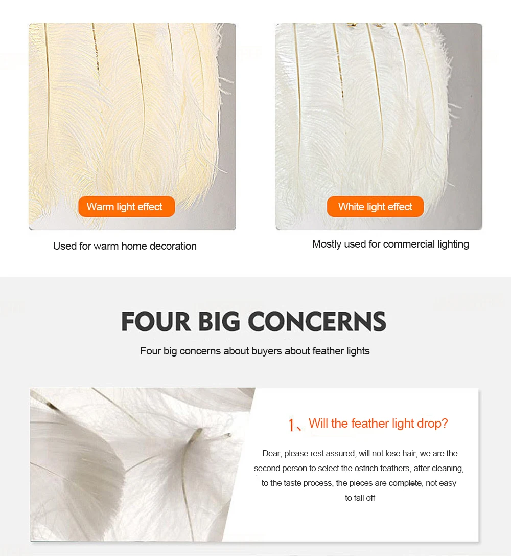 У покупателей есть четыре большие проблемы с перьевыми лампами 1. Опускаются ли перья? Дорогой, пожалуйста, будьте уверены, что перья не упадут. Мы тщательно выбираем страусиные перья. После очистки перья полностью заполнены и их нелегко отвалить во время процесса удаления вкуса