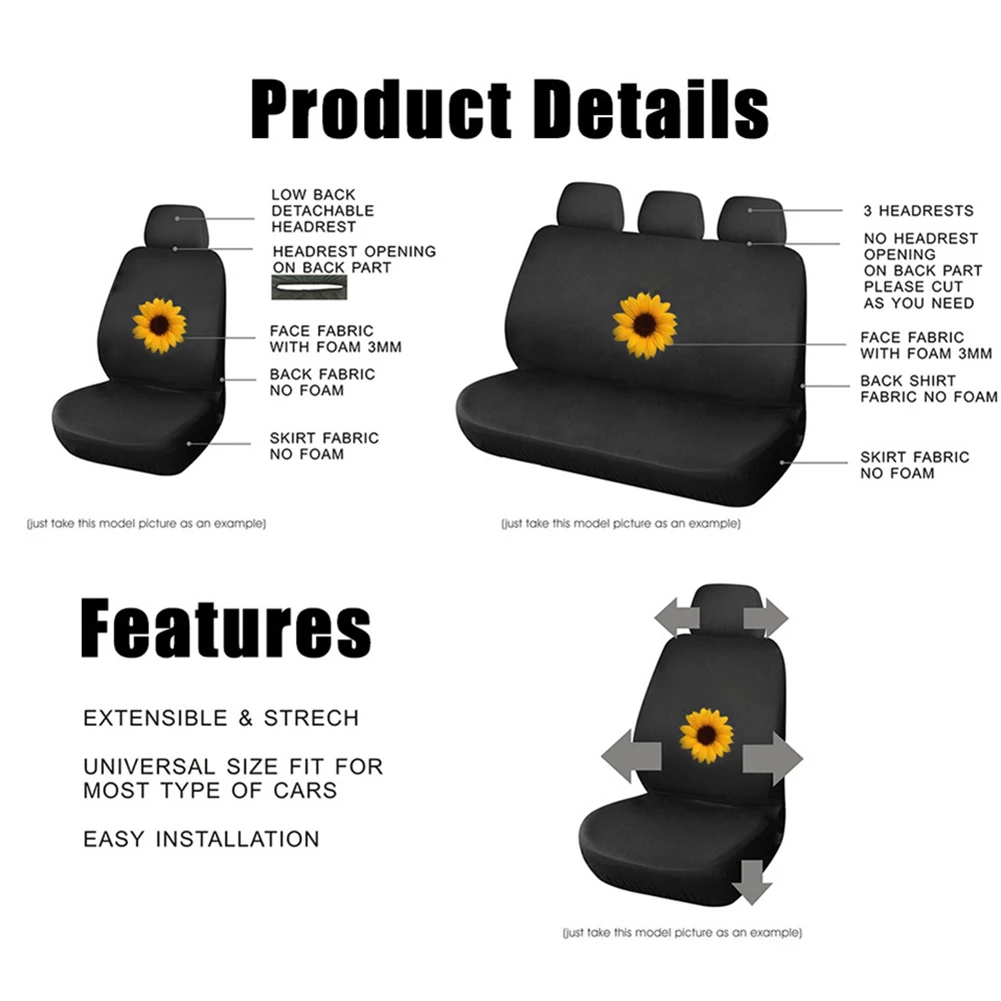 1. Универсальный размер подходит для большинства автомобилей, седанов и кроссоверов. 2. Модный принт подсолнечника. 3,5-нить швейная технология обеспечивает гораздо лучше долговечности. 4. Защитите сиденья, держите их чистыми и новыми. 5. Легко устанавливается и стирается. 6,9 шт. чехлы для сидений. 7. Ткань: высокоэластичная 100% полиэфирная ткань с отчетом о тестировании AZO free. 8. Под пеной: пенопласт высокой плотности хорошего качества 3 мм. 9. Эластичная петля: изготовлена из высококачественной эластичной ленты.