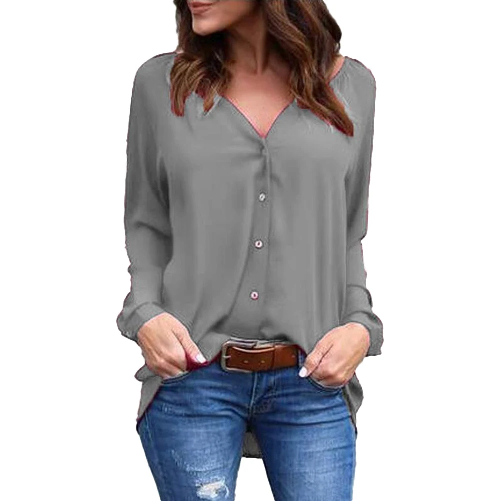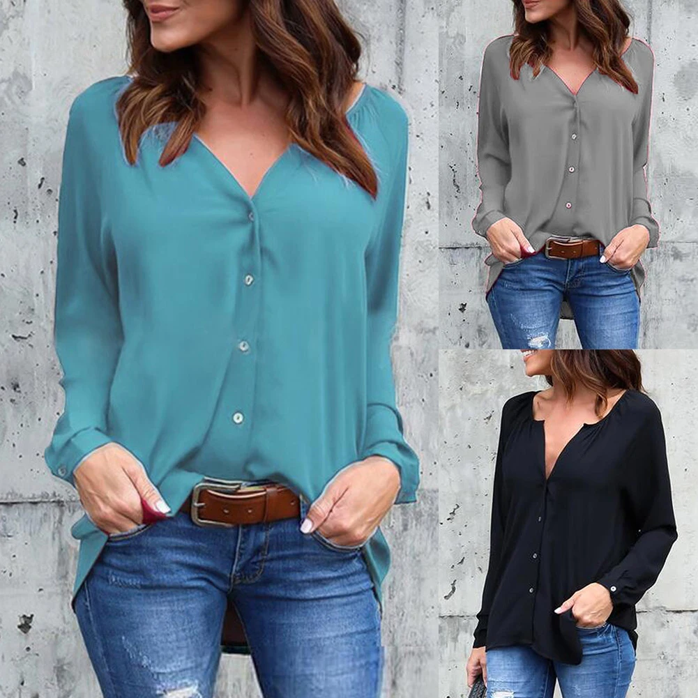 Однотонная плиссированная рубашка с v-образным вырезом и пуговицами с длинным рукавом женская шифоновая блузка Топ