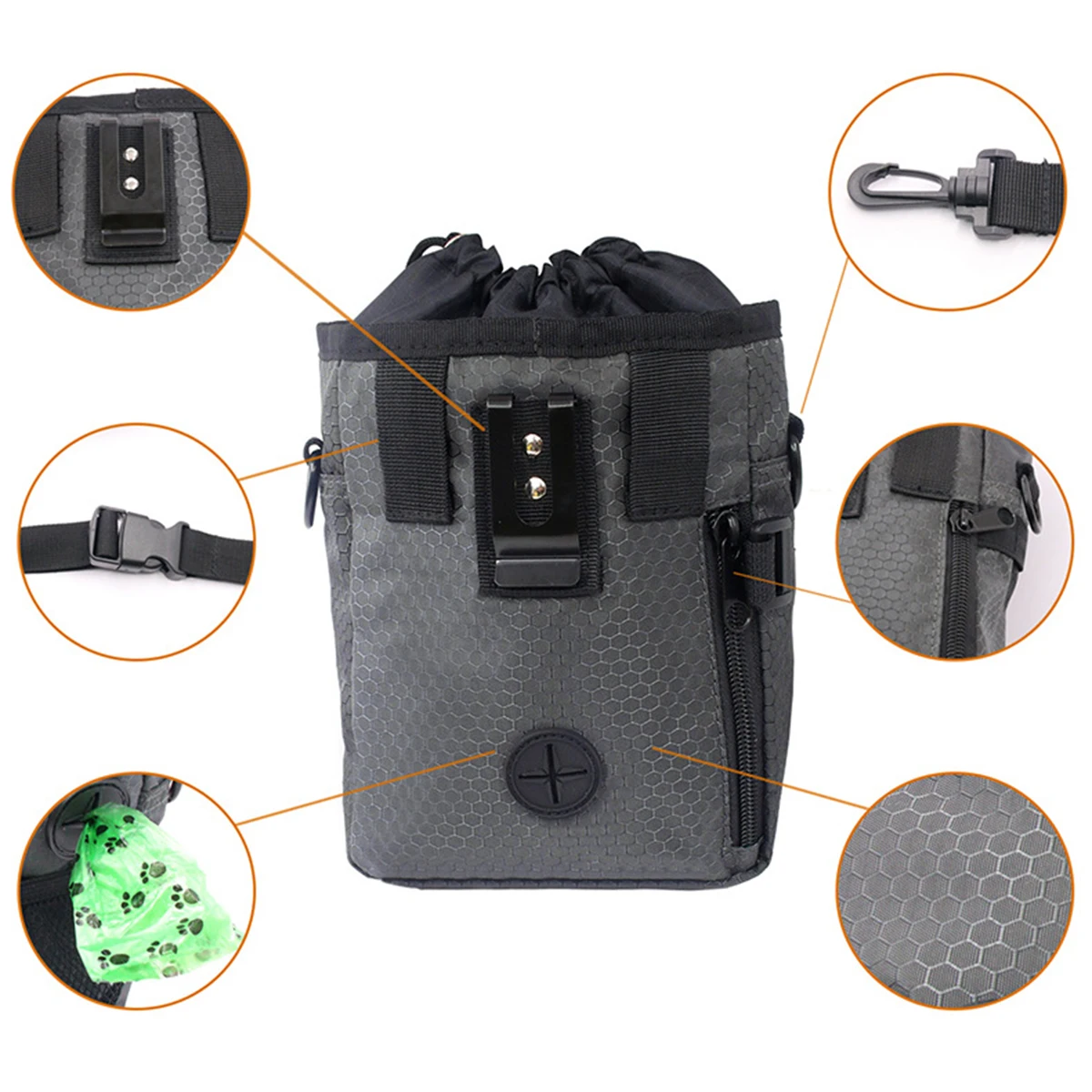 Классификация ваших вещей-дизайн с несколькими карманами для удобного хранения, сохраняет все предметы аккуратными и помогает быстро найти нужный вам товар. Передний сетчатый карман для тканей или игрушек для домашних животных, карман на молнии для телефона или других ценных вещей, карман на шнурке для закусок для домашних животных и задний карман на молнии для мусорных мешков.