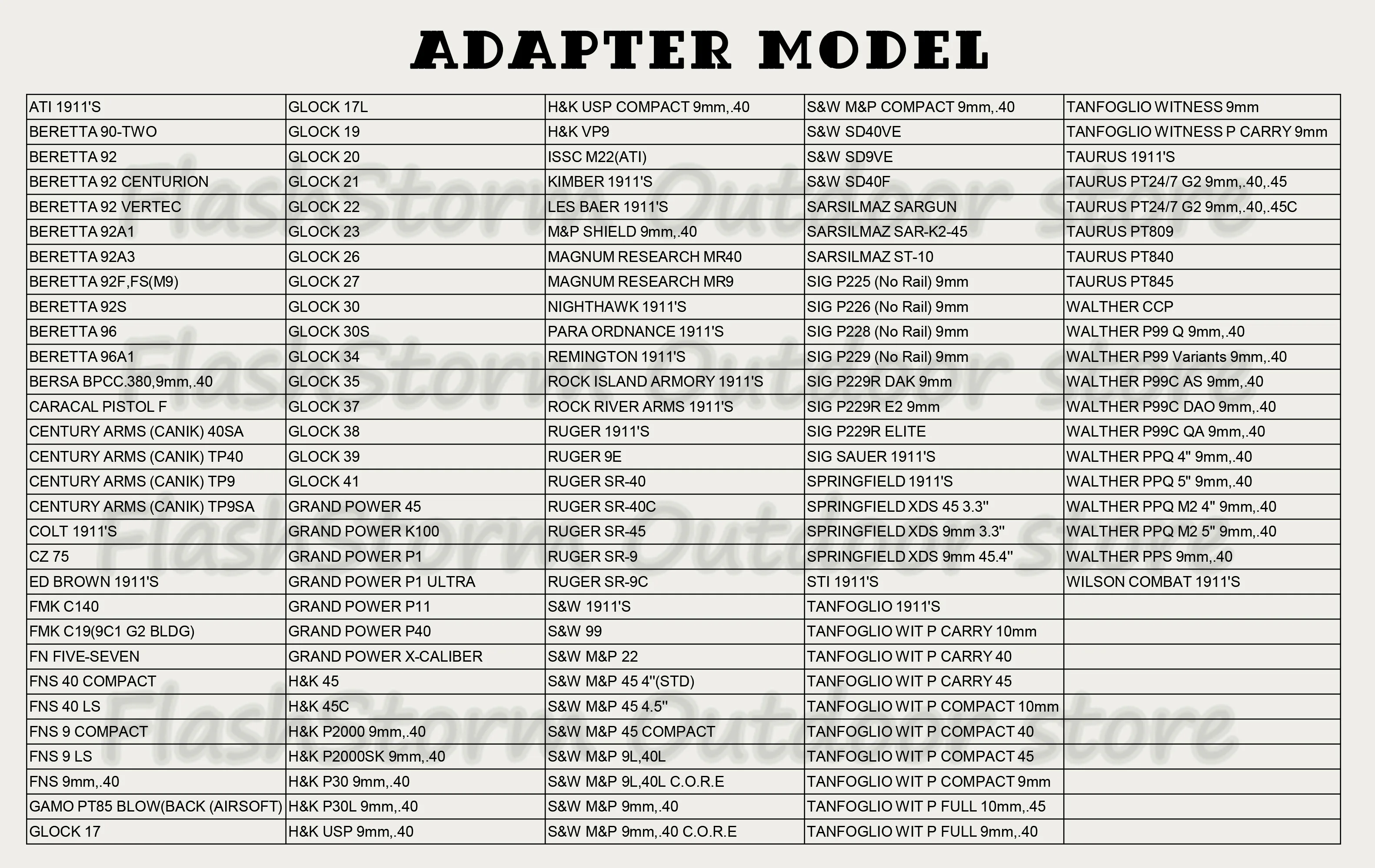 Подходит для:Glock 17,18C,20,21,22,37 H & K 45 H & K P30L H & K VP40 S & W M & P 22 S & W M & P 45 4,5 "S & W M & P 9 мм 40 S & W SW40F SIG P226 (без рельса) 9 мм Телец PT24 92F