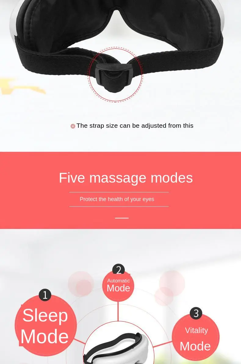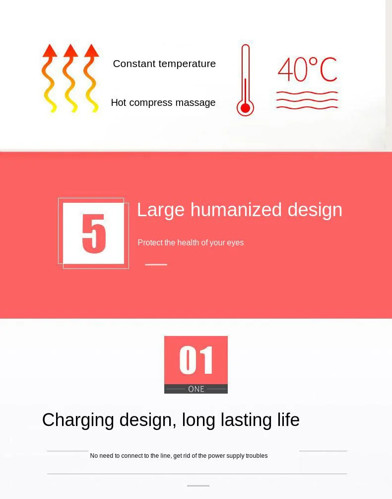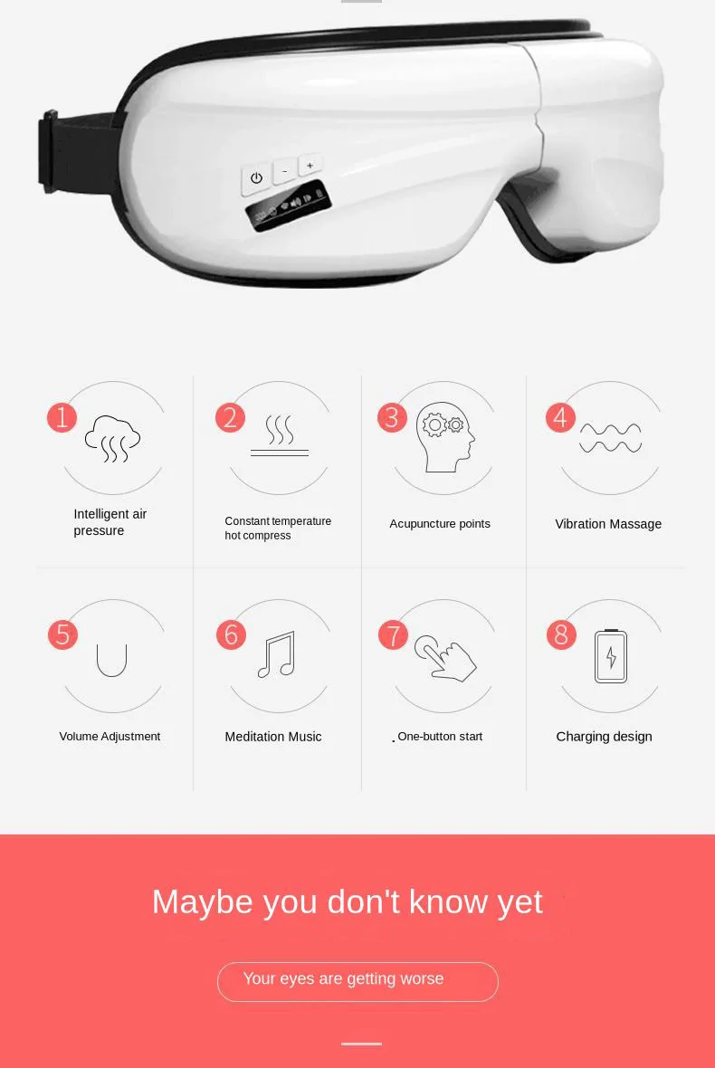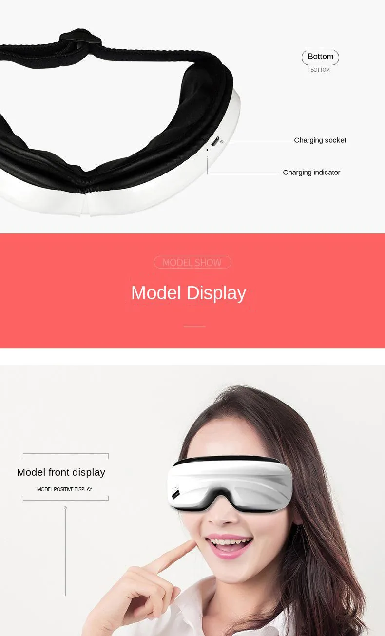 Преимущества Этот продукт использует технологию микрокомпьютерного управления инфракрасным нагревом, чтобы помочь мышцам глаз выполнять здоровые упражнения благодаря воздействию тепла, вибрации и разминания на глазах; внутри продукта есть воздушный мешок, который может повлиять на мышцы глаз через разумное сочетание надувания и дефляции. Разминающие массажные упражнения; В то же время, с функцией внутреннего вибрационного двигателя и эффектом нагрева дальних инфракрасных лучей, он оказывает многонаправленный массажный эффект на мышцы вокруг глаз. Инструкции Включение питания: Нажмите и удерживайте кнопку включения/режима в течение 2 секунд, чтобы включить устройство, и устройство по умолчанию в автоматическом режиме; нажмите эту кнопку один раз в режиме включения, чтобы включить режим массажа в свою очередь; Нажмите и удерживайте эту кнопку в течение 2 секунд, чтобы выключить устройство. Режим цикла управления одним ключом: Автоматический режим: давление воздуха + горячий компресс + музыка + вибрация ↓ Режим активности: давление воздуха + музыка + вибрация ↓ Чистый режим: давление воздуха + горячий компресс + музыка ↓ Динамический режим: давление воздуха + вибрация ↓ Режим сна: давление воздуха Напоминание: время работы по умолчанию составляет 15 минут при загрузке. Если вам нужно продлить время использования, вам нужно снова включить хост. (Рекомендуется, чтобы время каждого использования не превышало 15 минут)