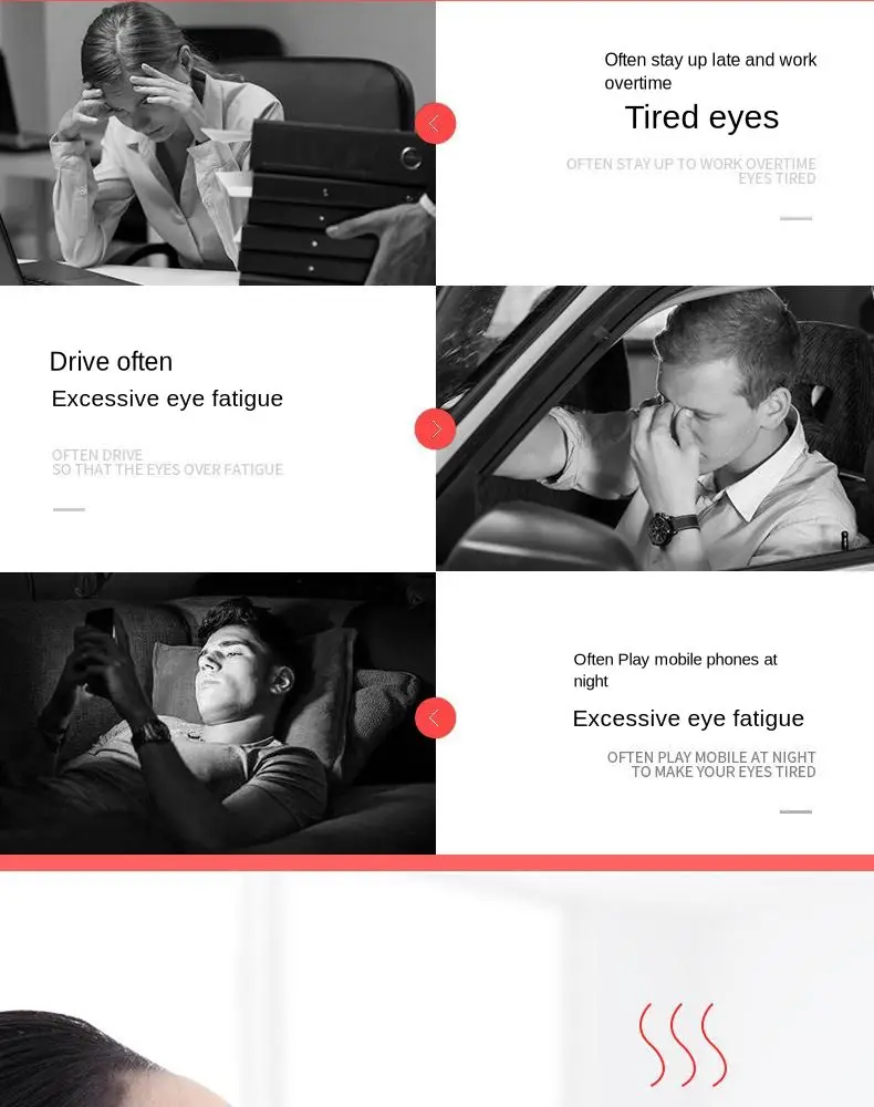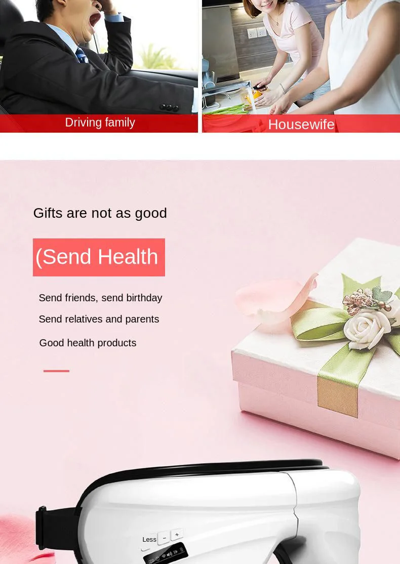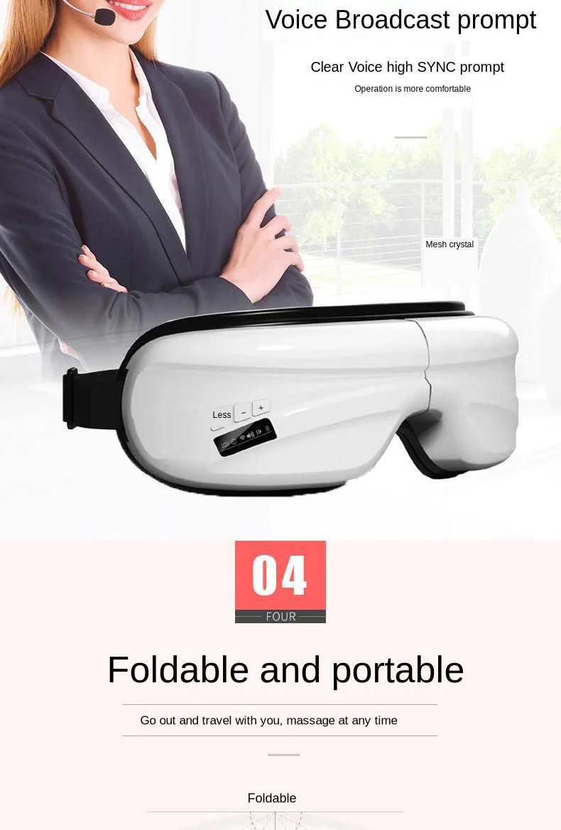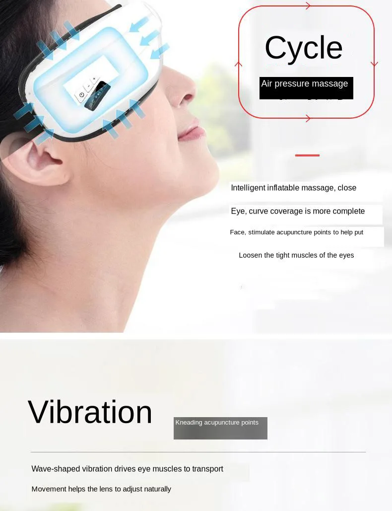 Преимущества Этот продукт использует технологию микрокомпьютерного управления инфракрасным нагревом, чтобы помочь мышцам глаз выполнять здоровые упражнения благодаря воздействию тепла, вибрации и разминания на глазах; внутри продукта есть воздушный мешок, который может повлиять на мышцы глаз через разумное сочетание надувания и дефляции. Разминающие массажные упражнения; В то же время, с функцией внутреннего вибрационного двигателя и эффектом нагрева дальних инфракрасных лучей, он оказывает многонаправленный массажный эффект на мышцы вокруг глаз. Инструкции Включение питания: Нажмите и удерживайте кнопку включения/режима в течение 2 секунд, чтобы включить устройство, и устройство по умолчанию в автоматическом режиме; нажмите эту кнопку один раз в режиме включения, чтобы включить режим массажа в свою очередь; Нажмите и удерживайте эту кнопку в течение 2 секунд, чтобы выключить устройство. Режим цикла управления одним ключом: Автоматический режим: давление воздуха + горячий компресс + музыка + вибрация ↓ Режим активности: давление воздуха + музыка + вибрация ↓ Чистый режим: давление воздуха + горячий компресс + музыка ↓ Динамический режим: давление воздуха + вибрация ↓ Режим сна: давление воздуха Напоминание: время работы по умолчанию составляет 15 минут при загрузке. Если вам нужно продлить время использования, вам нужно снова включить хост. (Рекомендуется, чтобы время каждого использования не превышало 15 минут)
