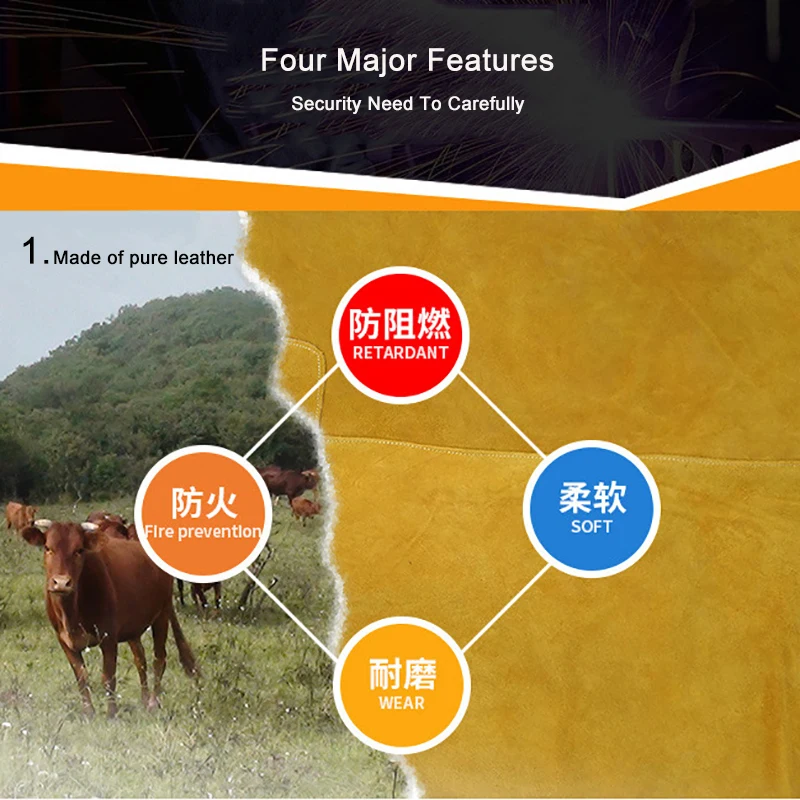 Материал: Воловья кожа Функция: высокая термостойкость Ли сиамский: сиамский Применение: электрическая сварка, бойлер, плавки Цвет: желтый, коричневый Вес: 1,6 кг