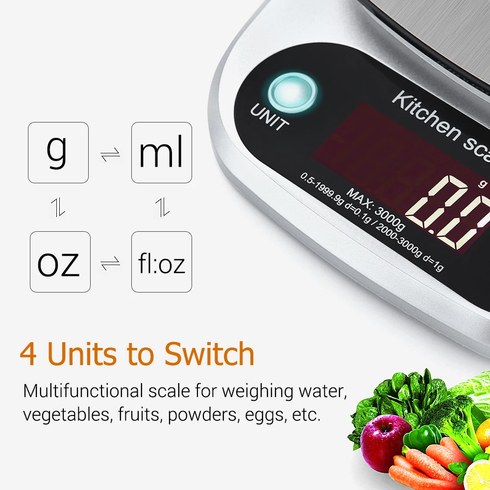 -4 единицы для переключения: g, ml, oz и fl:oz. Многофункциональные весы для взвешивания воды, овощей, фруктов, порошков, яиц и т. д.